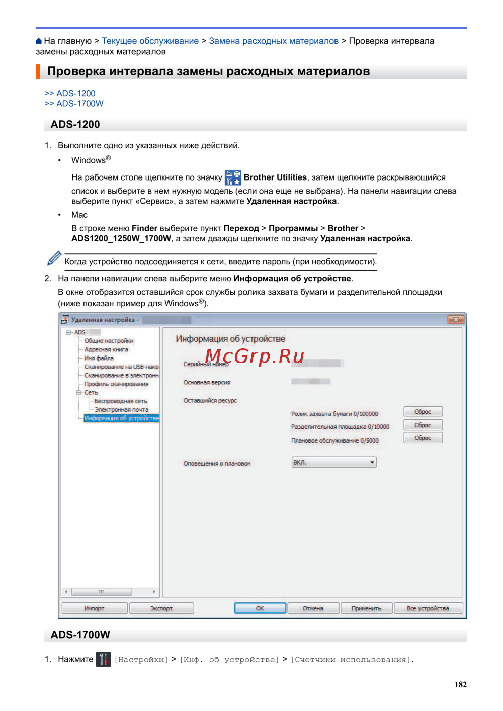 Brother ADS-1200 (ADS1200TC1) — проверка интервала замены расходных материалов для устройств [186/223]