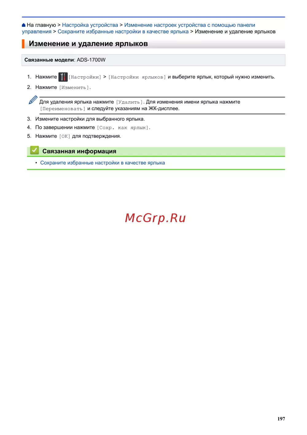 управления > Сохраните избранные настройки в качестве ярлыка > Изменение и удаление ярлыков