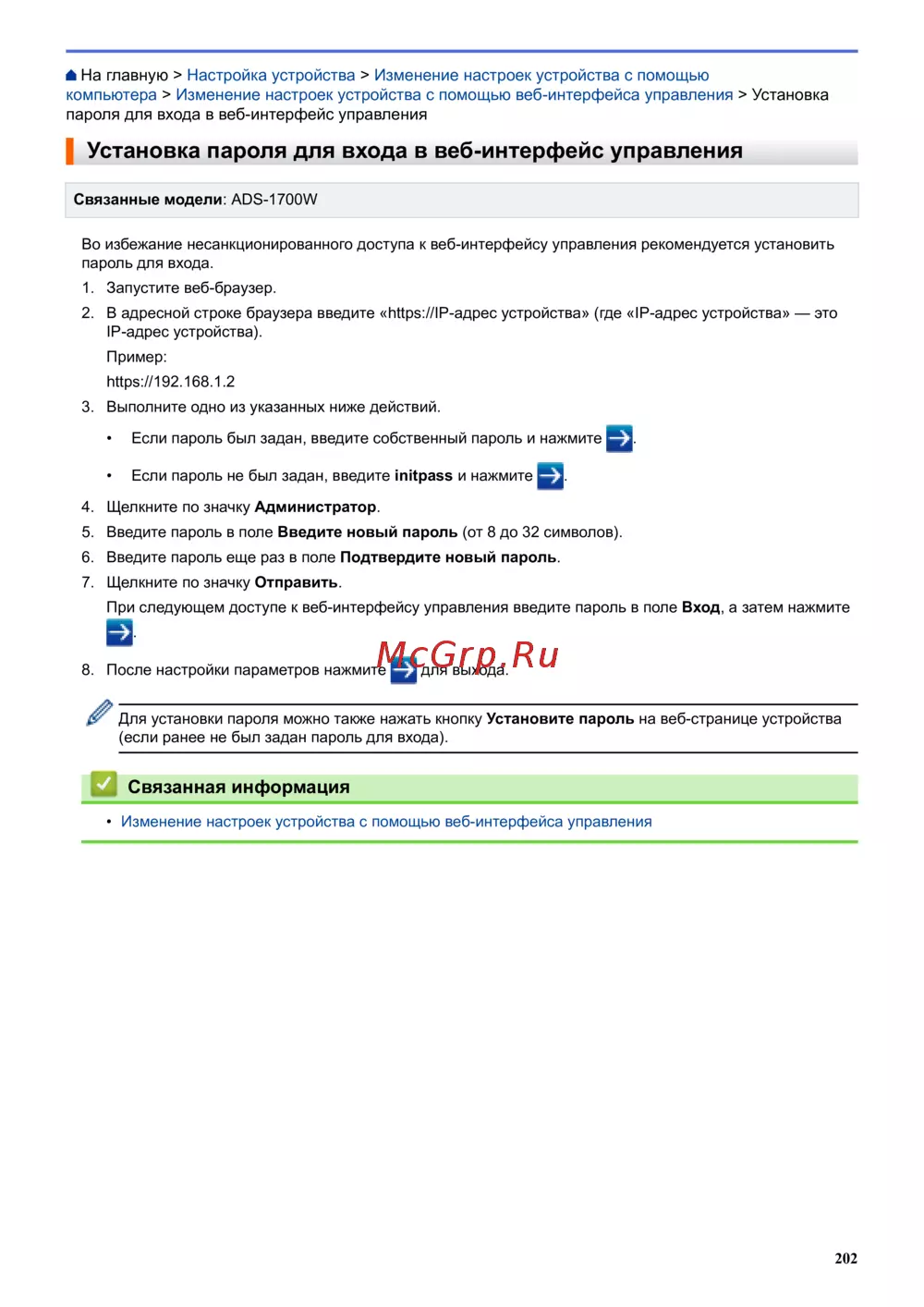 Для установки пароля можно также нажать кнопку Установите пароль на веб-странице устройства