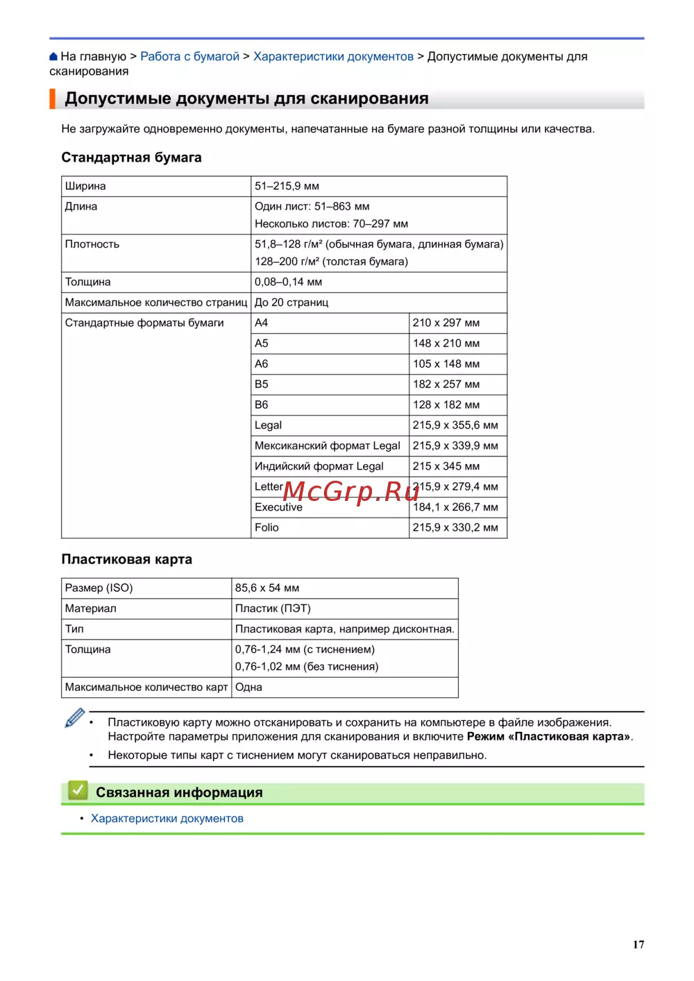 На главную > Работа с бумагой > Характеристики документов > Допустимые документы для
