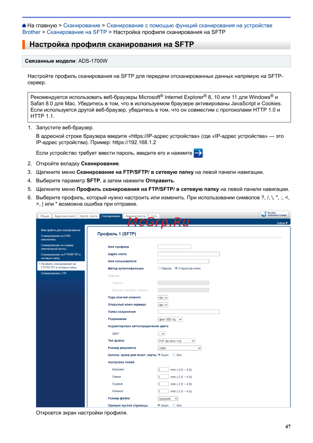 Узнайте, как настроить профиль сканирования на SFTP для передачи отсканированных данных. Подробная инструкция по настройке и совместимым браузерам.
