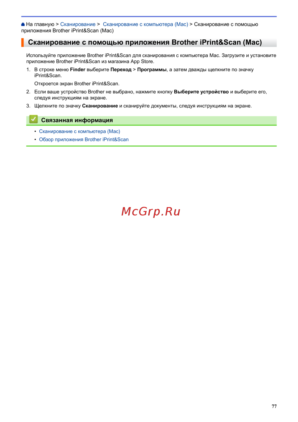 Используйте приложение Brother iPrint&Scan для сканирования с компьютера Mac. Загрузите и установите