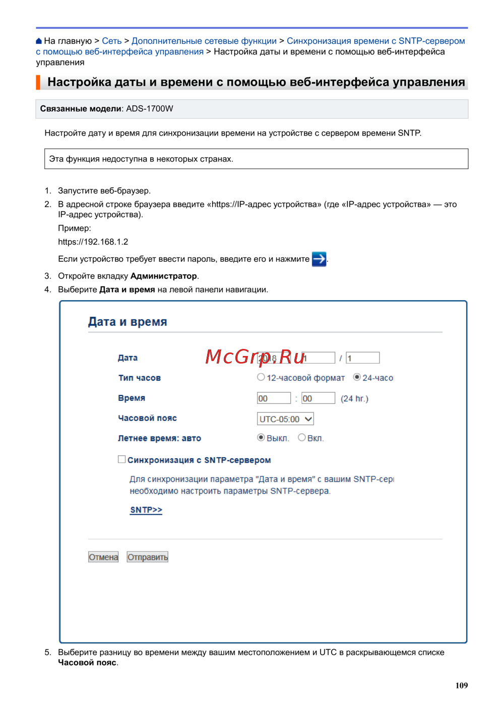Brother ADS-1700W (ADS1700WTC1) — настройка синхронизации времени с SNTP-сервером через веб-интерфейс [113/223]