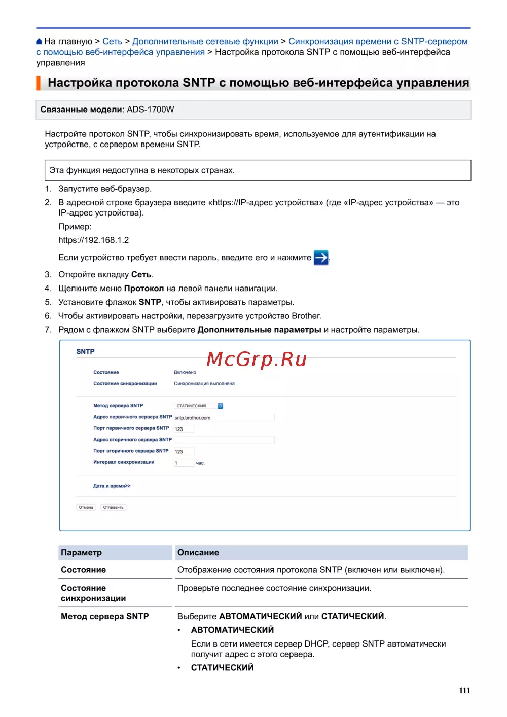 Brother ADS-1700W (ADS1700WTC1) — настройка протокола SNTP через веб-интерфейс управления [115/223]