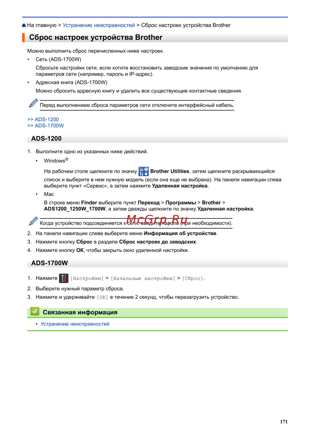 Brother ADS-1700W (ADS1700WTC1) — как выполнить сброс настроек устройства для устранения неисправностей [175/223]