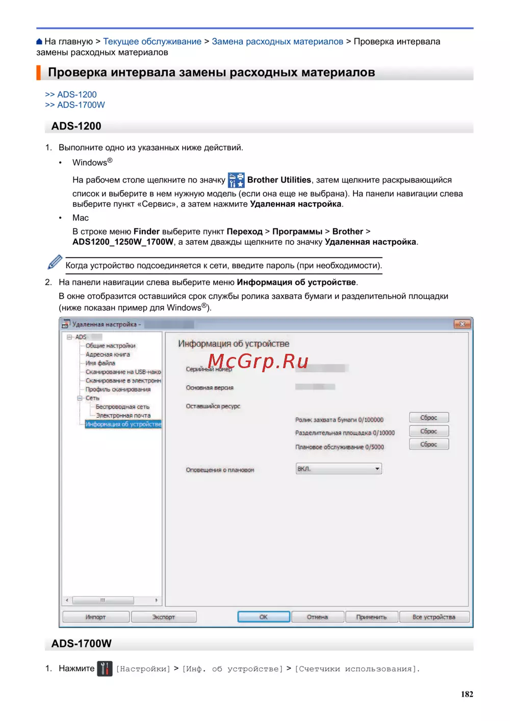 Brother ADS-1700W (ADS1700WTC1) — проверка интервала замены расходных материалов для устройств [186/223]