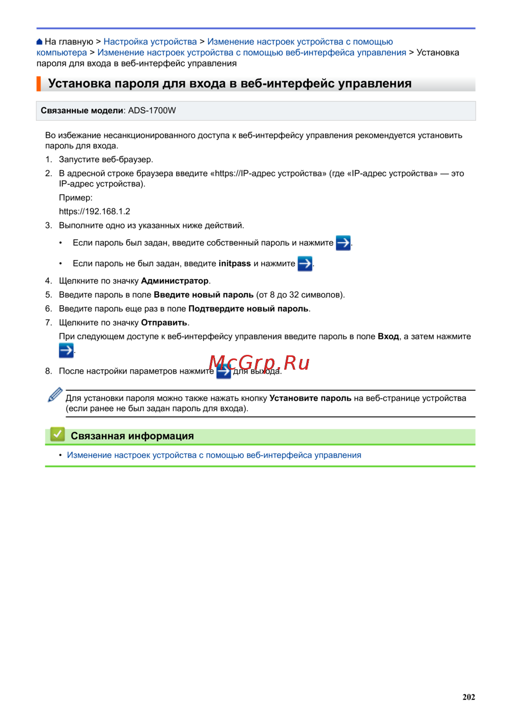 Brother ADS-1700W (ADS1700WTC1) — как установить пароль для веб-интерфейса управления устройством [206/223]