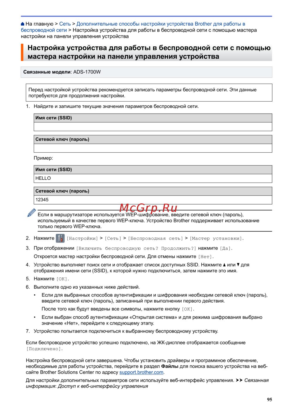Brother ADS-1700W (ADS1700WTC1) — настройка устройства для работы в беспроводной сети: пошаговое руководство [99/223]