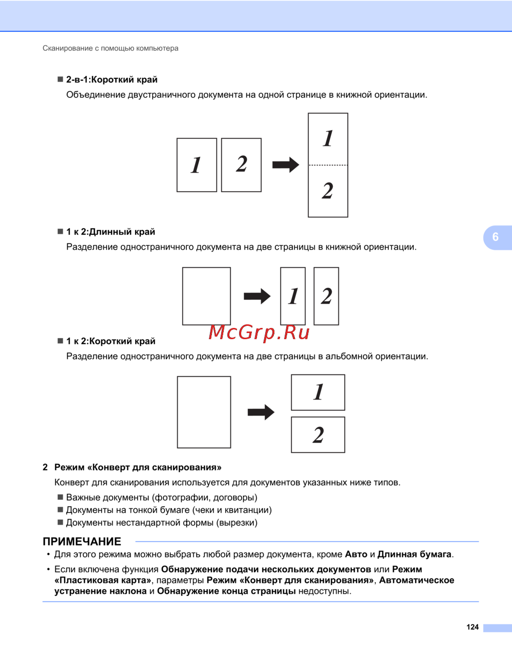 Узнайте о различных режимах сканирования документов, включая объединение и разделение страниц, а также особенности сканирования конвертов и нестандартных форматов.