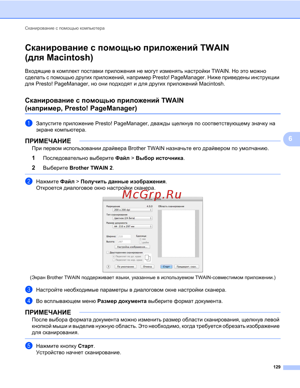 - При использовании для сканирования панели управления устройства brother и компьютера p.297