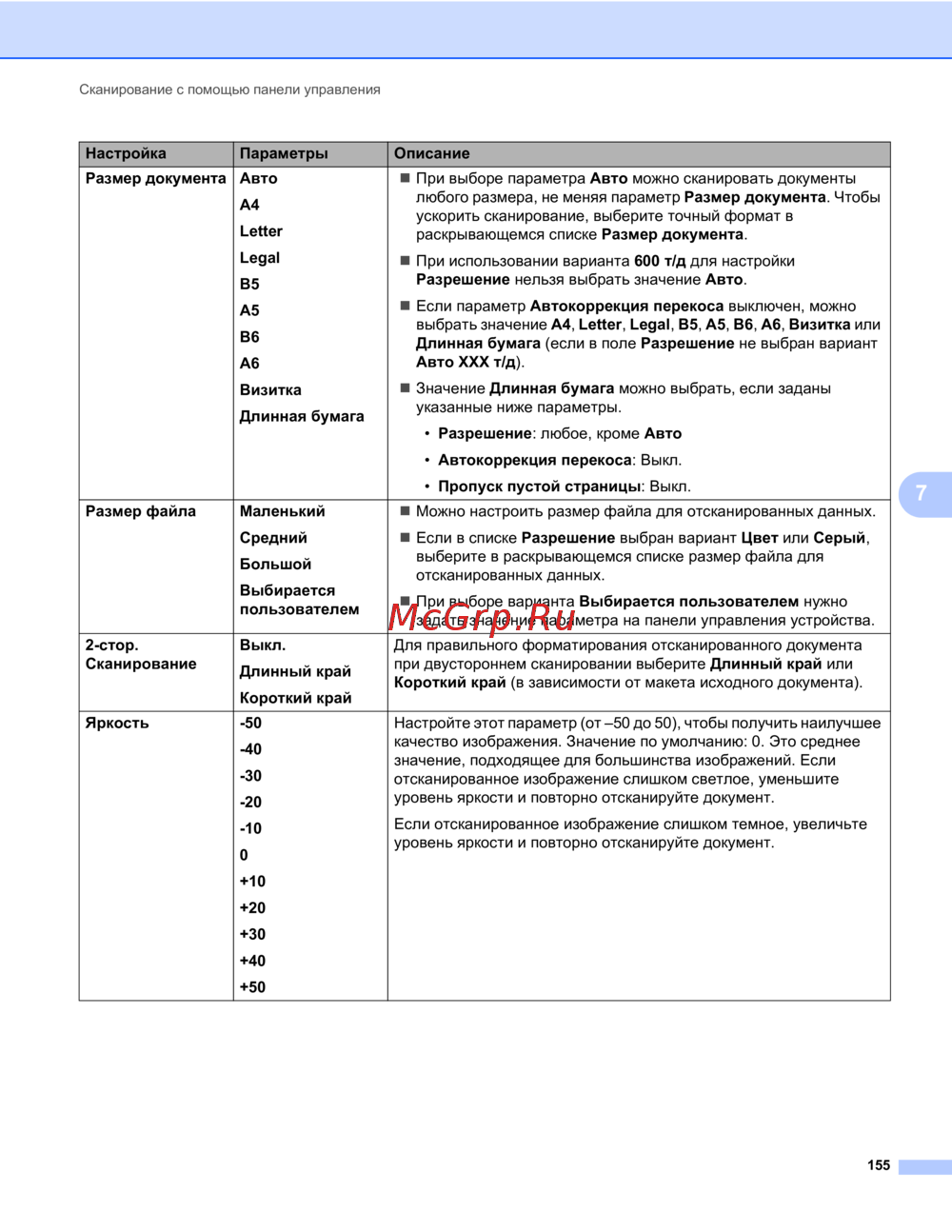 Узнайте, как правильно настроить параметры сканирования, включая выбор размера документа и регулировку яркости для достижения наилучшего качества изображения.