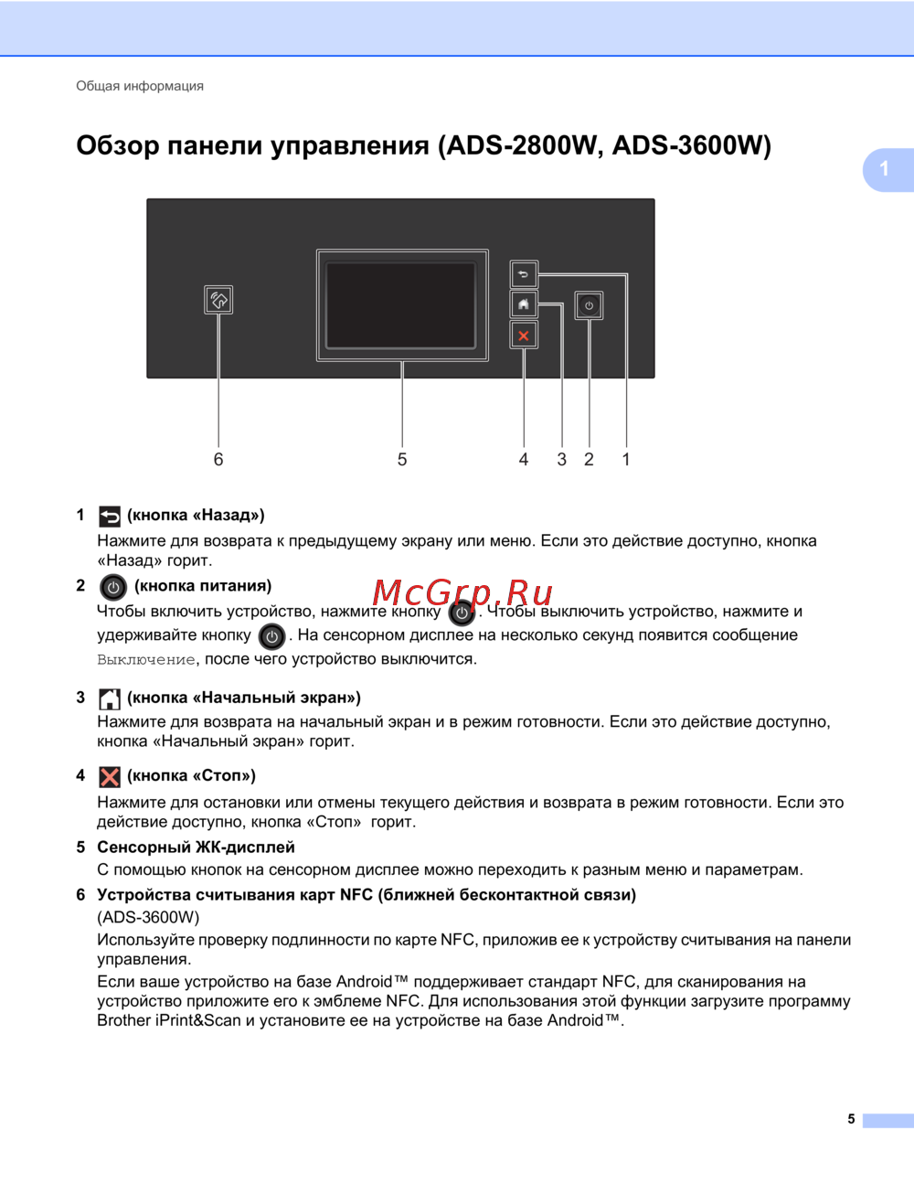 Обзор панели управления (ADS-2800W, ADS-3600W) 1