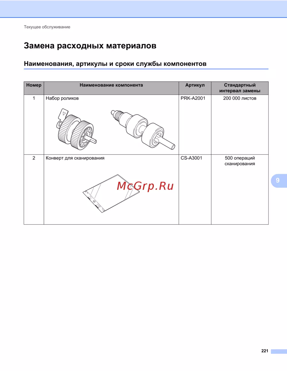 Brother ADS-2400N (ADS2400NUN1) [237/303] Наименования артикулы и сроки службы компонентов