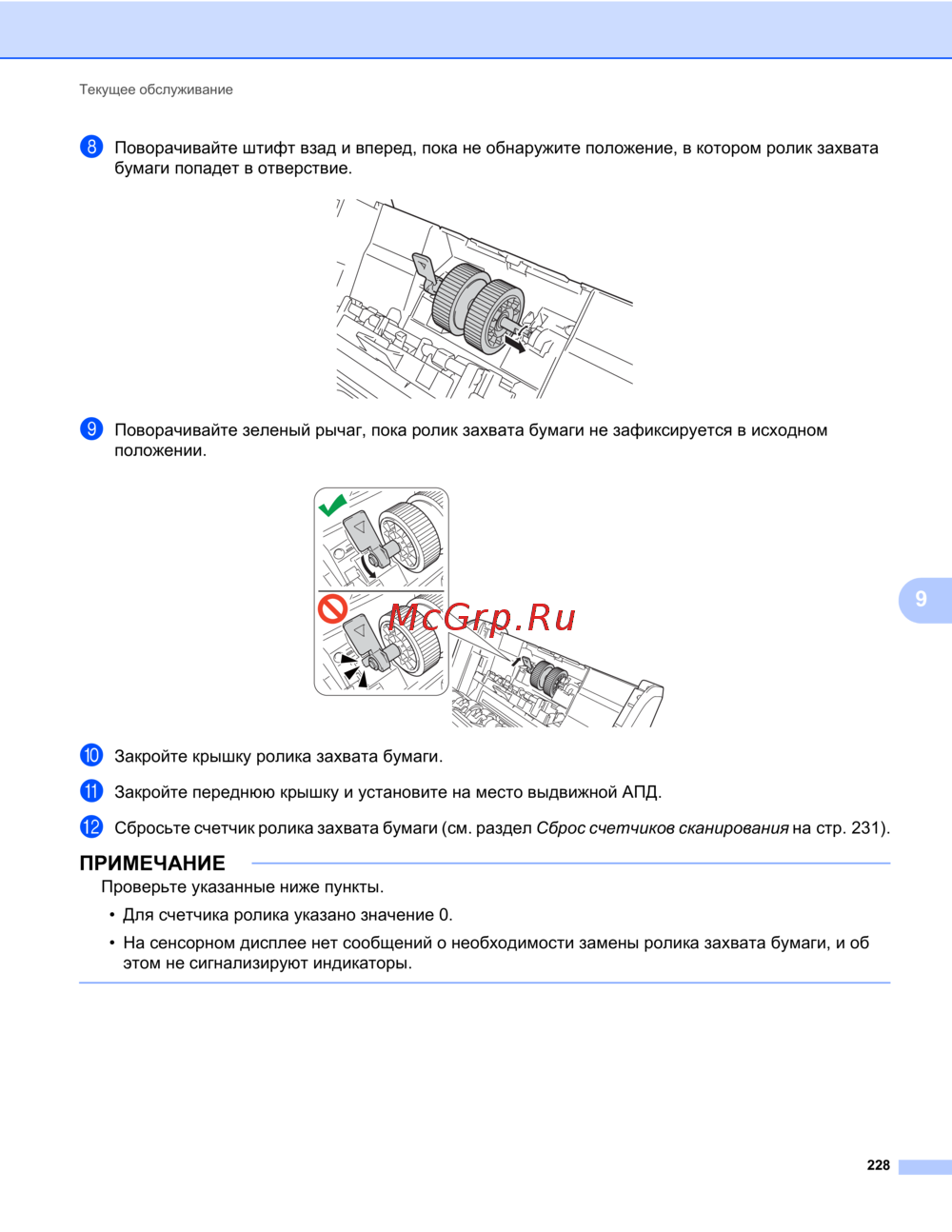 B Сбросьте счетчик ролика захвата бумаги (см. раздел Сброс счетчиков сканирования на стр. 231).