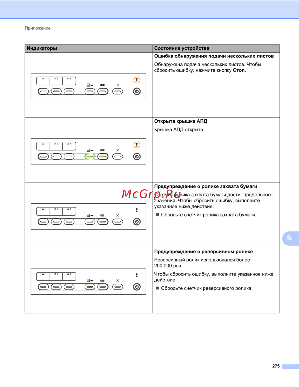 - Если пользователь не может устранить ошибку самостоятельно на устройстве одновременно загораются все индикаторы сигнализируя о необходимости сервисного обслуживания p.293