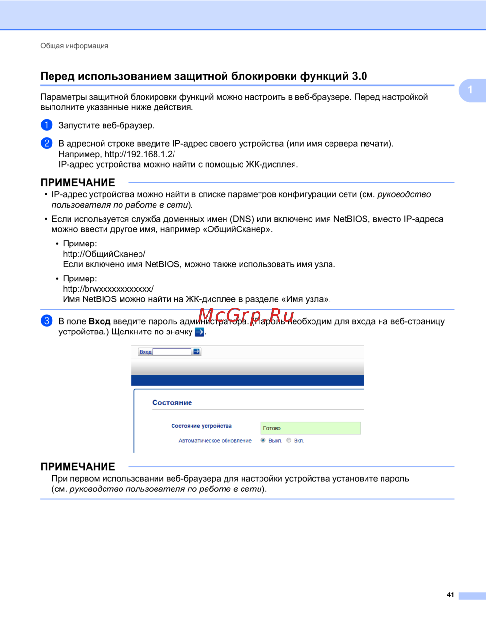 •IP-адрес устройства можно найти в списке параметров конфигурации сети (см. руководство