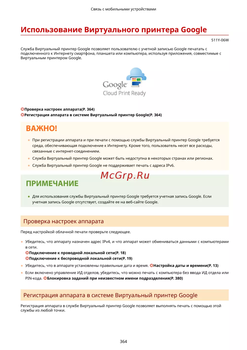 Регистрация аппарата в системе Виртуальный принтер Google(P. 364)