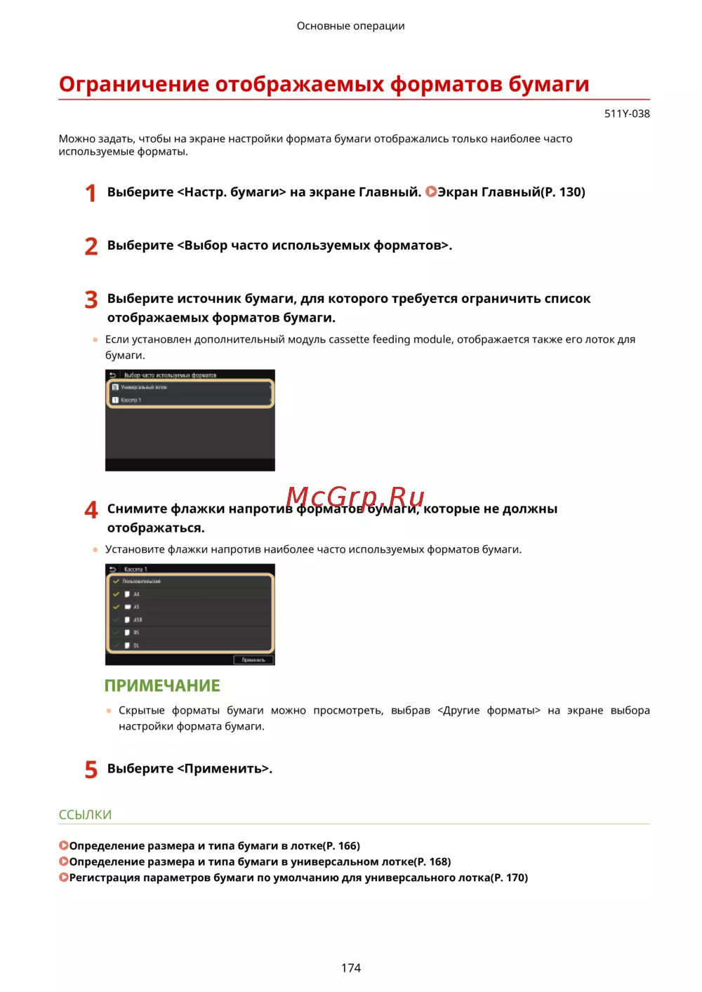Определение размера и типа бумаги в универсальном лотке(P. 168)