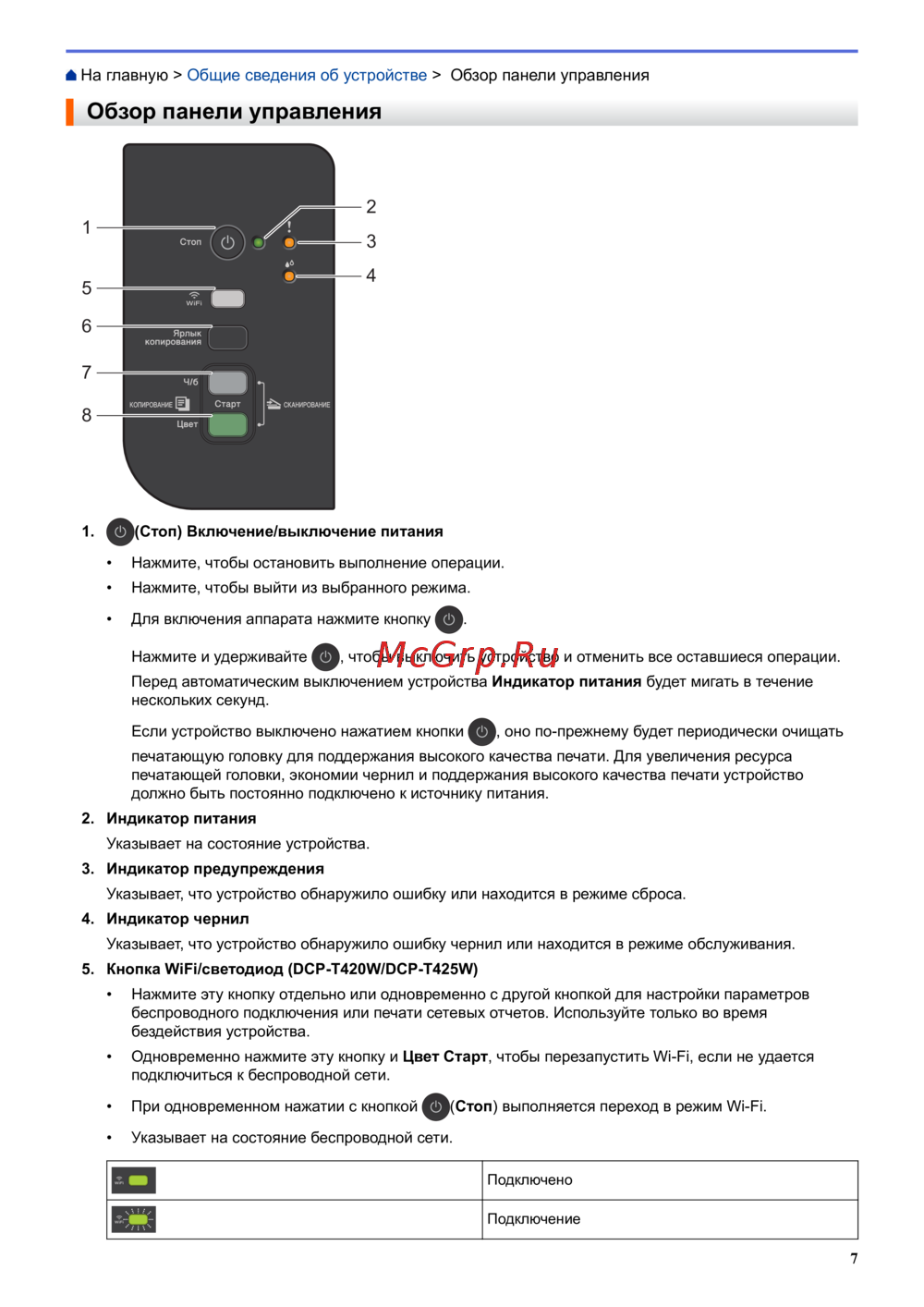5. Кнопка WiFi/светодиод (DCP-T420W/DCP-T425W)