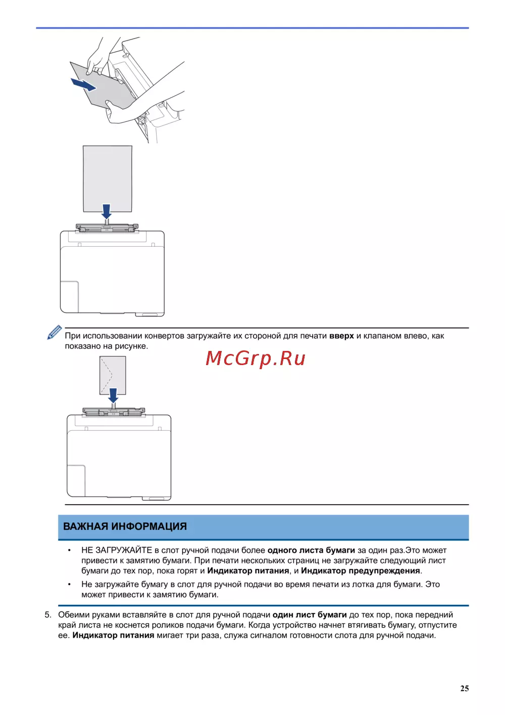 • НЕ ЗАГРУЖАЙТЕ в слот ручной подачи более одного листа бумаги за один раз.Это может