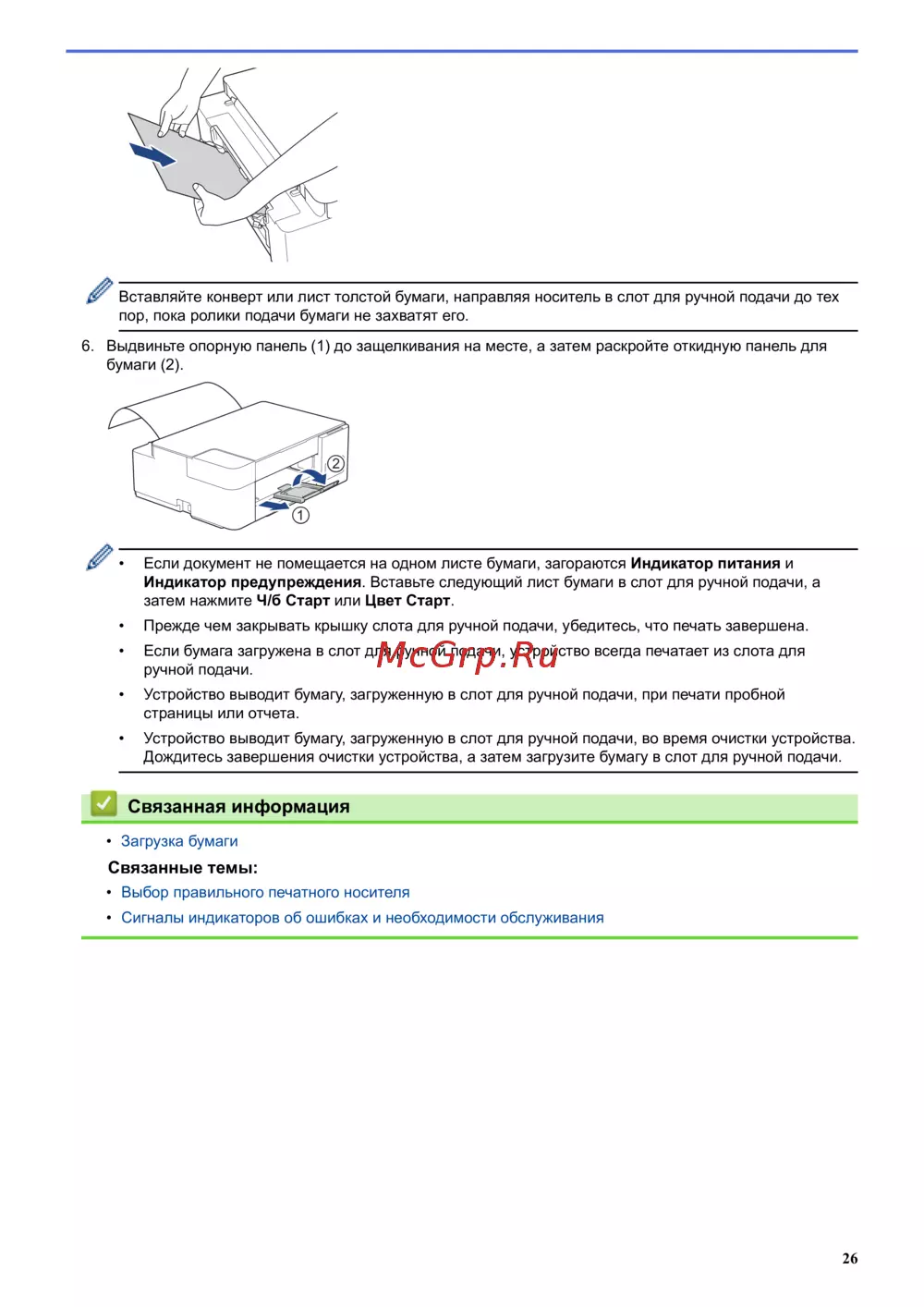 Индикатор предупреждения. Вставьте следующий лист бумаги в слот для ручной подачи, а