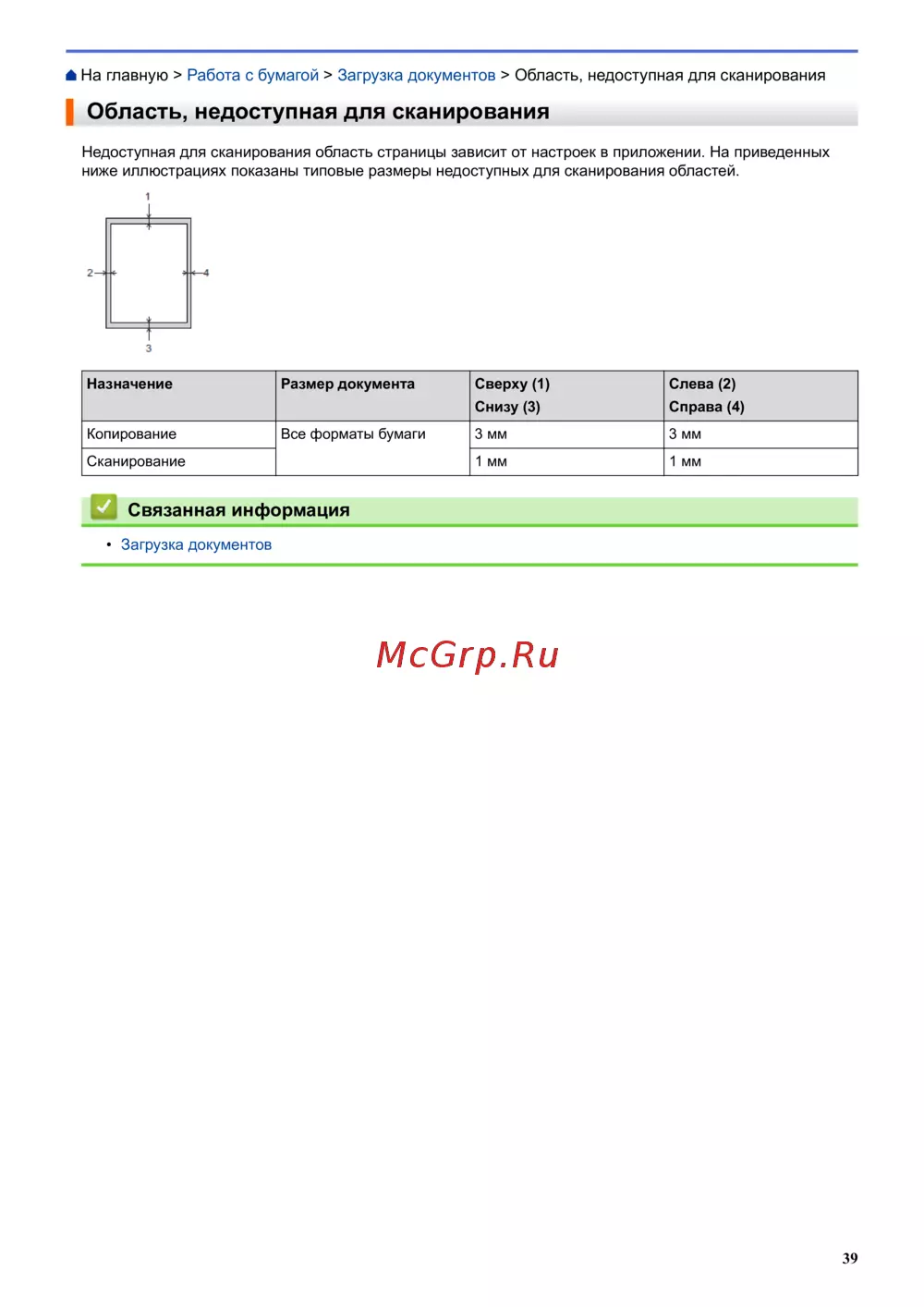 На главную > Работа с бумагой > Загрузка документов > Область, недоступная для сканирования