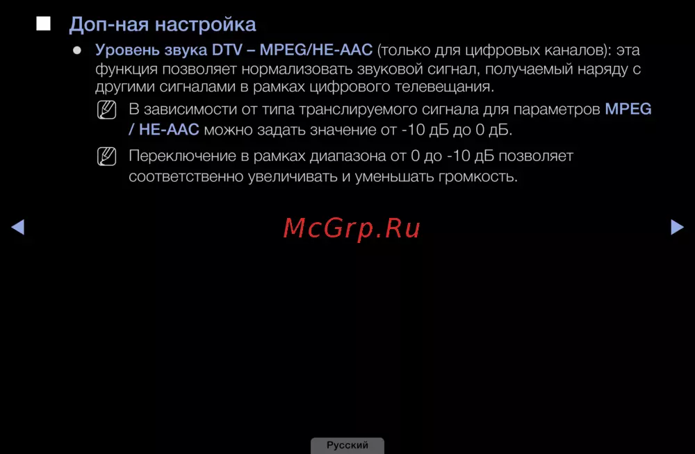 Уровень❑звука❑DTV❑–❑MPEG/HE-AAC❑(только для цифровых каналов): эта