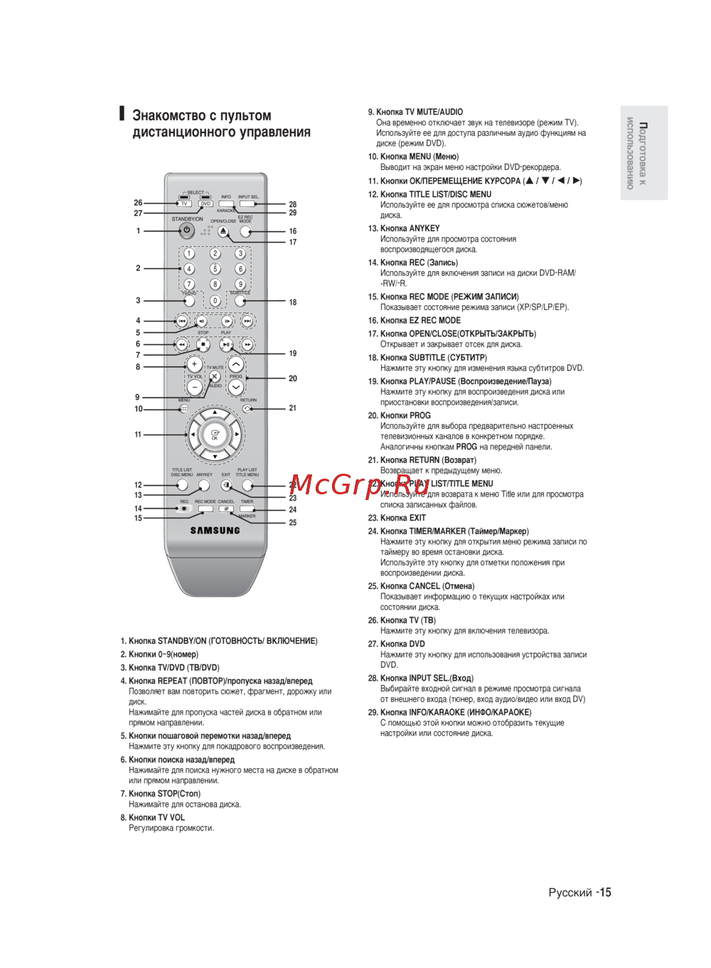 9 Кнопка TV MUTE AUDIO Подготовка к использованию I Знакомство с пультом дистанционного управления Она временно отключает звук на телевизоре режим TV Используйте ее для доступа различным аудио функциям на диске режим DVD 10 Кнопка MENU Меню Выводит на экран меню настройки DVD рекордера 11 Кнопки OK ПЕРЕМЕЩЕНИЕ КУРСОРА 12 Кнопка TITLE LIST DISC MENU Используйте ее для просмотра списка сюжетов меню диска 13 Кнопка ANYKEY Используйте для просмотра состояния воспроизводящегося диска 14 Кнопка REC Запись Используйте для включения записи на диски DVD RAM RW R 15 Кнопка REC MODE РЕЖИМ ЗАПИСИ Показывает состояние режима записи XP SP LP EP 16 Кнопка EZ REC MODE 17 Кнопка OPEN CLOSE OTKPblTb 3AKPblTb Открывает и закрывает отсек для диска 18 Кнопка SUBTITLE СУБТИТР Нажмите эту кнопку для изменения языка субтитров DVD 19 Кнопка PLAY PAUSE Воспроизведение Пауза Нажмите эту кнопку для воспроизведения диска или приостановки воспроизведения записи 20 Кнопки PROG Используйте для выбора предварительно настроенных телевизионных каналов в конкретном порядке Аналогичны кнопкам PROG на передней панели 21 Кнопка RETURN Возврат Возвращает к предыдущему меню 22 Кнопка PLAY LIST TITLE MENU Используйте для возврата к меню Title или для просмотра списка записанных файлов 23 Кнопка EXIT 24 Кнопка TIMER MARKER Таймер Маркер Нажмите эту кнопку для открытия меню режима записи по таймеру во время остановки диска Используйте эту кнопку для отметки положения при воспроизведении диска 25 Кнопка CANCEL Отмена Показывает информацию о текущих настройках или состоянии диска 26 Кнопка TV ТВ Нажмите эту кнопку для включения телевизора 1 Кнопка STANDBY ON ГОТОВНОСТЬ ВКЛЮЧЕНИЕ 2 Кнопки О Э номер 3 Кнопка TV DVD TB DVD 4 Кнопка REPEAT ПОВТОР пропуска назад вперед Позволяет вам повторить сюжет фрагмент дорожку или диск Нажимайте для пропуска частей диска в обратном или прямом направлении 5 Кнопки пошаговой перемотки назад вперед 27 Кнопка DVD Нажмите эту кнопку для использования устройства записи DVD 28 Кнопка INPUT SEL BXOA Выбирайте входной сигнал в режиме просмотра сигнала от внешнего входа тюнер вход аудио видео или вход DV 29 Кнопка INFO KARAOKE ИНФО КАРАОКЕ С помощью этой кнопки можно отобразить текущие настройки или состояние диска Нажмите эту кнопку для покадрового воспроизведения 6 Кнопки поиска назад вперед Нажимайте для поиска нужного места на диске в обратном или прямом направлении 7 Кнопка STOP Cron Нажимайте для останова диска 8 Кнопки TV VOL Регулировка громкости Русский 15