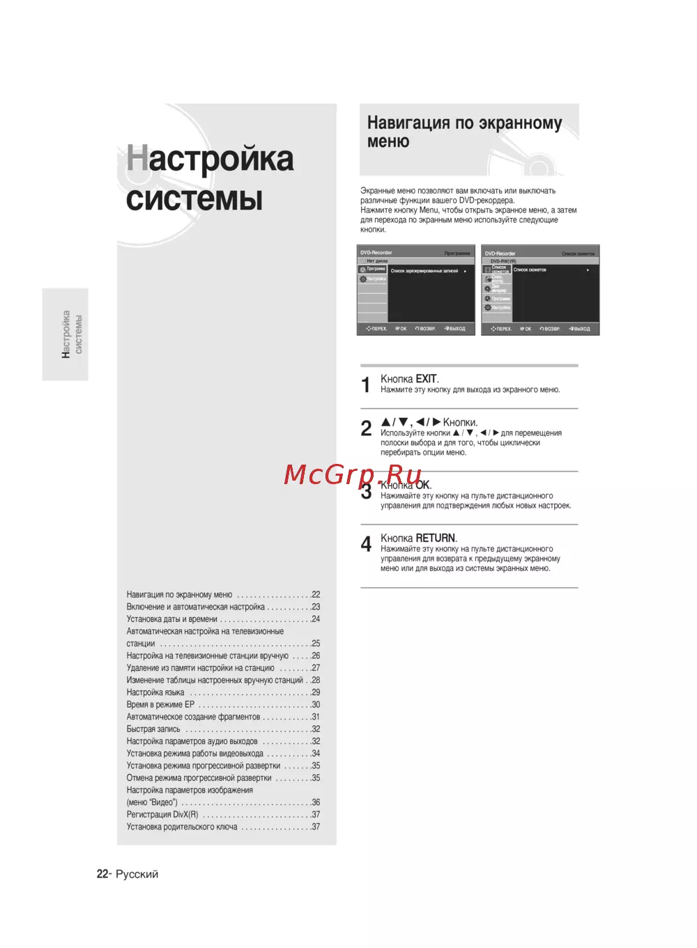 Настройка системы Навигация по экранному меню Экранные меню позволяют вам включать или выключать различные функции вашего DVD рекордера Нажмите кнопку Menu чтобы открыть экранное меню а затем для перехода по экранным меню используйте следующие Настройка системы кнопки 1 Кнопка EXIT Нажмите эту кнопку для выхода из экранного меню А Т Кнопки 2 Навигация по экранному меню 22 Включение и автоматическая настройка 23 Установка даты и времени 24 Автоматическая настройка на телевизионные станции 25 Настройка на телевизионные станции вручную 26 Удаление из памяти настройки на станцию 27 Изменение таблицы настроенных вручную станций 28 Настройка языка 29 Время в режиме ЕР 30 Автоматическое создание фрагментов 31 Быстрая запись 32 Настройка параметров аудио выходов 32 Установка режима работы видеовыхода 34 Установка режима прогрессивной развертки 35 Отмена режима прогрессивной развертки 35 Настройка параметров изображения меню Видео 36 Регистрация ЙУХ Я 37 Установка родительского ключа 37 22 Русский Используйте кнопки для перемещения полоски выбора и для того чтобы циклически перебирать опции меню 3 Кнопка ОК 4 Кнопка RETURN Нажимайте эту кнопку на пульте дистанционного управления для подтверждения любых новых настроек Нажимайте эту кнопку на пульте дистанционного управления для возврата к предыдущему экранному меню или для выхода из системы экранных меню