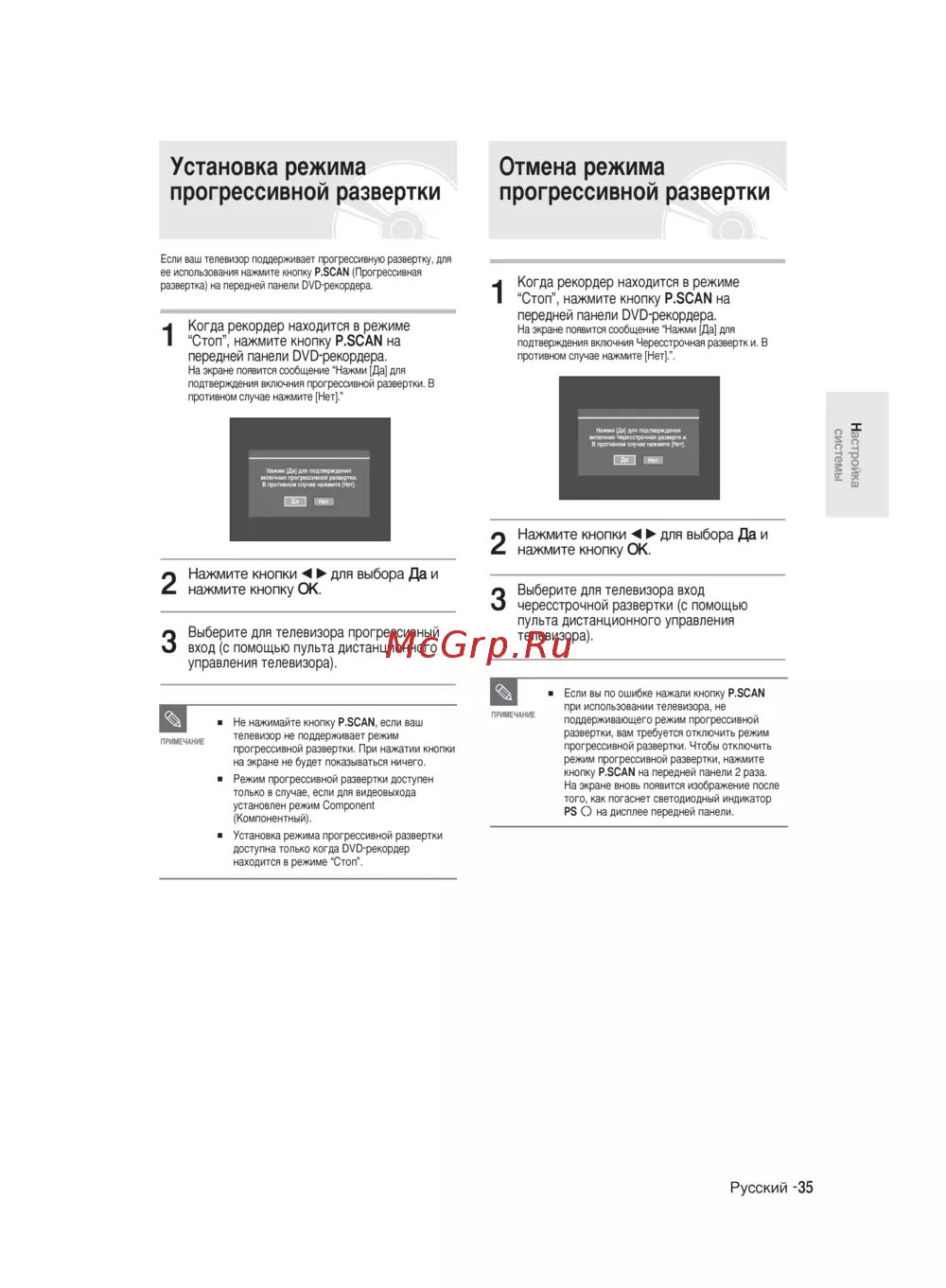 Установка режима прогрессивной развертки Если ваш телевизор поддерживает прогрессивную развертку для ее использования нажмите кнопку Р ЗСАМ Прогрессивная развертка на передней панели ОУО рекордера Отмена режима прогрессивной развертки 1 Когда рекордер находится в режиме Стоп нажмите кнопку Р ЗСАЫ на передней панели О О рекордера 1 Когда рекордер находится в режиме Стоп нажмите кнопку Р ЗСАЫ на передней панели ОУОрекордера На экране появится сообщение Нажми Да для подтверждения включния Чересстрочная развертк и В противном ср чае нажмите Нет На экране появится сообщение Нажми Да для подтверждения включния прогрессивной развертки В противном случае нажмите Нет мми Да дня подт ееа ден тра рксш ои миерткл В пхл мм случае наилмте Нет 1 ДП нет 2 Нажмите кнопки для выбора Да и нажмите кнопку ОК 3 Выберите для телевизора прогрессивный вход с помощью пульта дистанционного управления телевизора 2 Нажмите кнопки для выбора Да и нажмите кнопку ОК 3 Выберите для телевизора вход чересстрочной развертки с помощью пульта дистанционного управления телевизора ПЕММЕЧАШЕ ПРИМЕЧАНИЕ Не нажимайте кнопку Р ЗСАЫ если ваш телевизор не поддерживает режим прогрессивной развертки При нажатии кнопки на экране не будет показываться ничего Режим прогрессивной развертки доступен только в случае если для видеовыхода установлен режим Сотропеп Компонентный Если вы по ошибке нажали кнопку Р ЗСАМ при использовании телевизора не поддерживающего режим прогрессивной развертки вам требуется отключить режим прогрессивной развертки Чтобы отключить режим прогрессивной развертки нажмите кнопку Р ЗСАМ на передней панели 2 раза На экране вновь появится изображение после того как погаснет светодиодный индикатор РЗ О на дисплее передней панели Установка режима прогрессивной развертки доступна только когда ОУО рекордер находится в режиме Стоп Русский 35