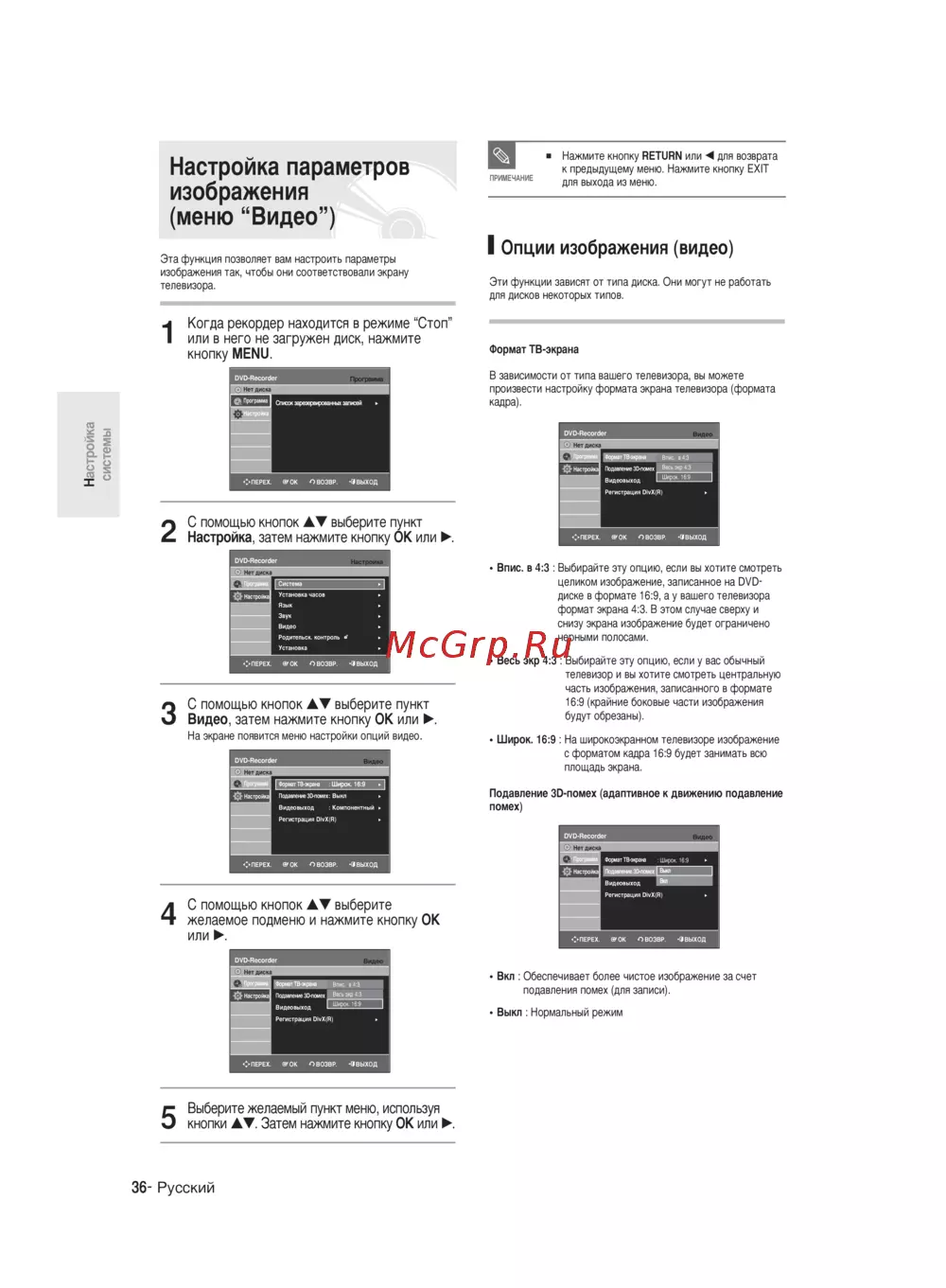 Настройка параметров изображения меню Видео Нажмите кнопку RETURN или для возврата к предыдущему меню Нажмите кнопку EXIT ПРИМЕМ АИЛ для выхода из меню I Опции изображения видео Эта функция позволяет вам настроить параметры изображения так чтобы они соответствовали экрану телевизора 1 Эти функции зависят от типа диска Они могут не работать для дисков некоторых типов Когда рекордер находится в режиме Стоп или в него не загружен диск нажмите Формат ТВ экрана Настройка системы В зависимости от типа вашего телевизора вы можете произвести настройку формата экрана телевизора формата кадра 2 С помощью кнопок АТ выберите пункт Настройка затем нажмите кнопку ОК или Впис в 4 3 Выбирайте эту опцию если вы хотите смотреть целиком изображение записанное на ОУОдиске в формате 16 9 а у вашего телевизора формат экрана 4 3 В этом случае сверху и снизу экрана изображение будет ограничено черными полосами Весь экр 4 3 Выбирайте эту опцию если у вас обычный телевизор и вы хотите смотреть центральную часть изображения записанного в формате З С помощью кнопок АТ выберите пункт Видео затем нажмите кнопку ОК или На экране появится меню настройки опций видео 16 9 крайние боковые части изображения будут обрезаны Широк 16 9 На широкоэкранном телевизоре изображение с форматом кадра 16 9 будет занимать всю площадь экрана Подавление ЗО помех адаптивное к движению подавление помех 4 С помощью кнопок АТ выберите желаемое подменю и нажмите кнопку ОК или Вкл Обеспечивает более чистое изображение за счет подавления помех для записи Выкл Нормальный режим 5 Выберите желаемый пункт меню используя кнопки АТ Затем нажмите кнопку ОК или 36 Русский