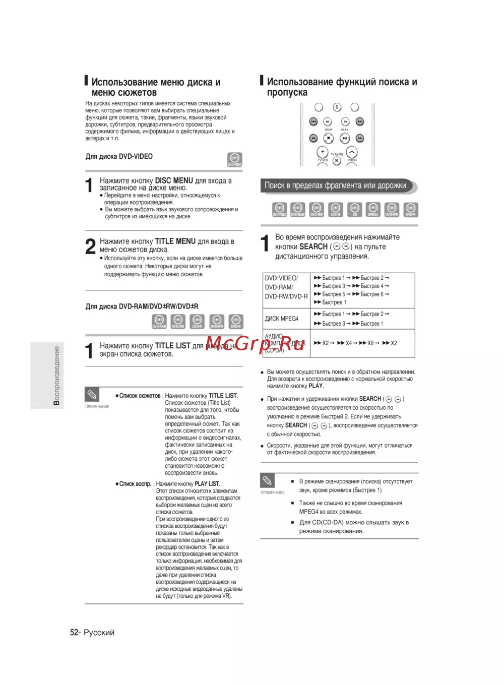 I Использование функций поиска и пропуска I Использование меню диска и меню сюжетов На дисках некоторых типов имеется система специальных меню которые позволяют вам выбирать специальные функции для сюжета такие фрагменты языки звуковой дорожки субтитров предварительного просмотра содержимого фильма информации о действующих лицах и актерах и т п Для диска DVD VIDEO 1 Нажмите кнопку DISC MENU для входа в записанное на диске меню Поиск в пределах фрагмента или дорожки j Перейдите в меню настройки относящемуся к операции воспроизведения Kl tsl К tsi tSlVsw Kl ЕЛ t l Вы можете выбрать язык звукового сопровождения и субтитров из имеющихся на диске 2 Во время воспроизведения нажимайте 1 Нажмите кнопку TITLE MENU для входа в меню сюжетов диска Используйте эту кнопку если на диске имеется больше кнопки SEARCH 00 на пульте дистанционного управления одного сюжета Некоторые диски могут не поддерживать функцию меню сюжетов DVD VIDEO Быстрее 1 Быстрее 2 DVD RAM Быстрее 3 Быстрее 4 DVD RW DVD R кд кд Быстрее 5 Быстрее 6 Быстрее 1 Для диска DVD RAM DVD RW DVD R Быстрее 1 Быстрее 2 ДИСК MPEG4 Быстрее 3 Быстрее 1 1 1 Дд АУДИО 1 Нажмите кнопку TITLE LIST для вывода на экран списка сюжетов КОМПАКТ ДИСК Х2 Х4 Х8 Х2 CD DA Вы можете осуществлять поиск и в обратном направлении Для возврата к воспроизведению с нормальной скоростью нажмите кнопку PLAY Список сюжетов Нажмите кнопку TITLE LIST ПРИМЕЧАШЕ Список сюжетов Title List показывается для того чтобы помочь вам выбрать определенный сюжет Так как список сюжетов состоит из информации о видеосигналах фактически записанных на диск при удалении какоголибо сюжета этот сюжет становится невозможно воспроизвести вновь Списк воспр Нажмите кнопку PLAY UST Этот сгисск относится к элементам воспроизведения которые создаются выбором желаемых сцен из всего воспроизведение осуществляется со скоростью по умолчанию в режиме Быстрый 2 Если не удерживать кнопку SEARCH воспроизведение осуществляется с обычной скоростью Скорости указанные для этой функции могут отличаться от фактической скорости воспроизведения В режиме сканирования поиска отсутствует ПРИМЕ ЧАШЕ звук кроме режимов Быстрее 1 Также не слышно во время сканирования списка сюжетов При воспроизведении одного из списков воспроизведения будут МРЕЭ4 во всех режимах пэказаны только выбранные пэльзоватепем сцены и затем режиме сканирования рекордер остановится Так как в список воспроизведения включается только информация необходимая для воспроизведения желаешх сцен то даже гри удалении списка воспроизведения содержащиеся на диске исходные видеоданные удалены не будут только для режима VR 52 Русский При нажатии и удерживании кнопки SEARCH Q Q Для СЭ СЭ СА можно слышать звук в