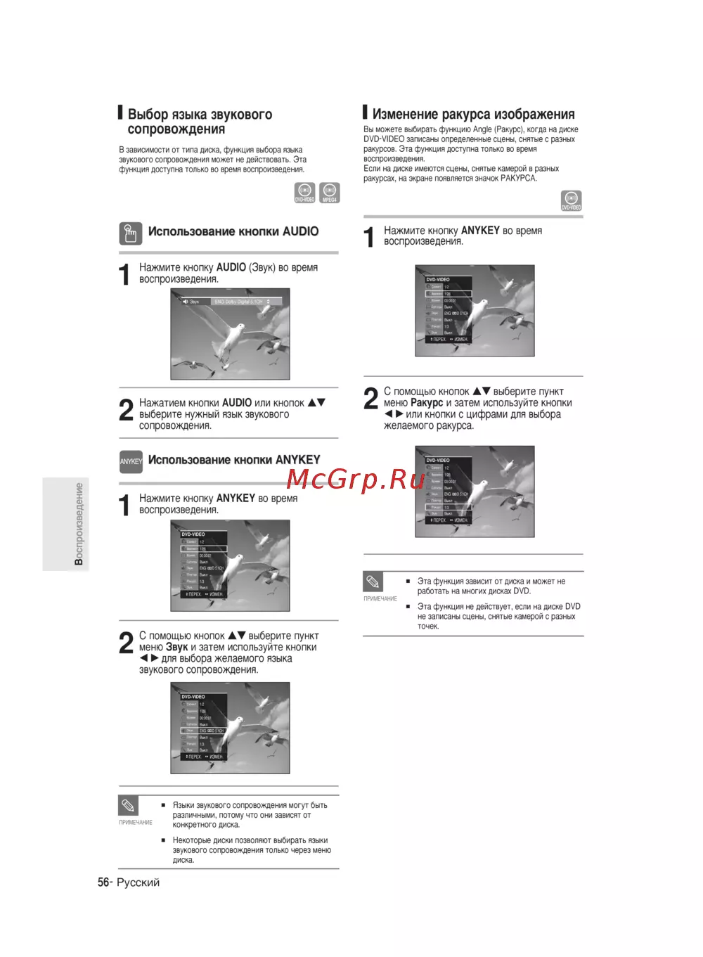 I Выбор языка звукового I Изменение ракурса изображения сопровождения В зависимости от типа диска функция выбора языка звукового сопровождения может не действовать Эта функция доступна только во время воспроизведения Вы можете выбирать функцию Angle Ракурс когда на диске DVD VIDEO записаны определенные сцены снятые с разных ракурсов Эта функция доступна только во время воспроизведения Если на диске имеются сцены снятые камерой в разных ракурсах на экране появляется значок РАКУРСА ШИ СИ Нажмите кнопку ANYKEY во время воспроизведения Использование кнопки AUDIO Нажмите кнопку AUDIO Звук во время воспроизведения 2 Нажатием кнопки AUDIO или кнопок АТ выберите нужный язык звукового сопровождения 2 С помощью кнопок АТ выберите пункт меню Ракурс и затем используйте кнопки или кнопки с цифрами для выбора желаемого ракурса Использование кнопки ANYKEY Нажмите кнопку ANYKEY во время воспроизведения Эта функция зависит от диска и может не работать на многих дисках DVD ПРИМЕ ЧАШЕ Эта функция не действует если на диске DVD не записаны сцены снятые камерой с разных точек 2 С помощью кнопок АТ выберите пункт меню Звук и затем используйте кнопки для выбора желаемого языка звукового сопровождения Языки звукового сопровождения могут быть различными потому что они зависят от конкретного диска Некоторые диски позволяют выбирать языки звукового сопровождения только через меню диска 56 Русский