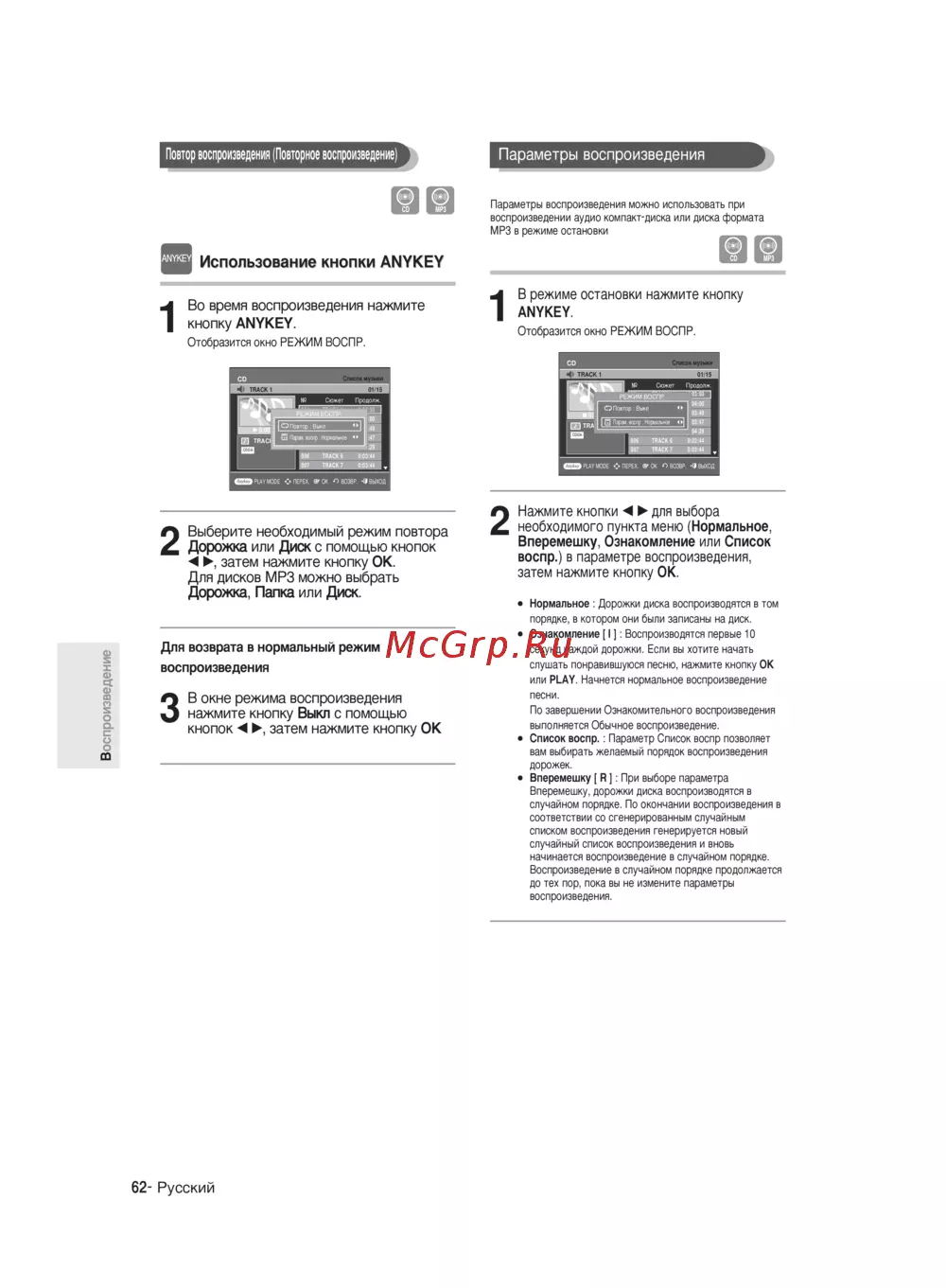 Повтор воспроизведения Повторное воспроизведение Параметры воспроизведения Параметры воспроизведения можно использовать при воспроизведении аудио компакт диска или диска формата МРЗ в режиме остановки Использование кнопки ANYKEY В режиме остановки нажмите кнопку Во время воспроизведения нажмите 1 кнопку ANYKEY 1 ANYKEY Отобразится окно РЕЖИМ ВОСПР Отобразится окно РЕЖИМ ВОСПР 2 Выберите необходимый режим повтора Дорожка или Диск с помощью кнопок затем нажмите кнопку ОК Для дисков МРЗ можно выбрать Дорожка Папка или Диск 2 Нажмите кнопки для выбора необходимого пункта меню Нормальное Вперемешку Ознакомление или Список воспр в параметре воспроизведения затем нажмите кнопку ОК Нормальное Дорожки диска воспроизводятся в том порядке в котором они были записаны на диск Ознакомление I Воспроизводятся первые 10 Для возврата в нормальный режим секунд каждой дорожки Если вы хотите начать воспроизведения слушать понравившуюся песню нажмите кнопку ОК или PLAY Начнется нормальное воспроизведение З В окне режима воспроизведения нажмите кнопку Выкл с помощью кнопок затем нажмите кнопку ОК песни По завершении Ознакомительного воспроизведения выполняется Обычное воспроизведение Список воспр Параметр Список воспр позволяет вам выбирать желаемый порядок воспроизведения дорожек Вперемешку R При выборе параметра Вперемешку дорожки диска воспроизводятся в случайном порядке По окончании воспроизведения в соответствии со сгенерированным случайным списком воспроизведения генерируется новый случайный список воспроизведения и вновь начинается воспроизведение в случайном порядке Воспроизведение в случайном порядке продолжается до тех пор пока вы не измените параметры воспроизведения 62 Русский