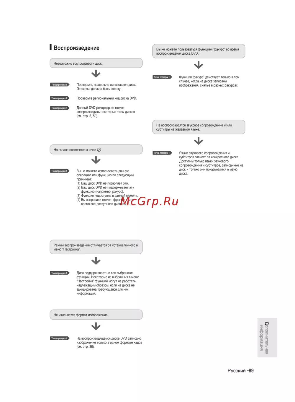 I Воспроизведение Вы не можете пользоваться функцией ракурс во время воспроизведения диска DVD Невозможно воспроизвести диск Точка про ры 1 Точ а проверь 1 Проверьте правильно ли вставлен диск Этикетка должна быть сверху Точ 2 про р ки2 Проверьте региональный код диска DVD Точ з про р ки 3 Данный DVD рекордер не может воспроизводить некоторые типы дисков см стр 5 50 Функция ракурс действует только в том случае когда на диске записаны изображения снятые в разных ракурсах ГЛ Не воспроизводятся звуковое сопровождение и или субтитры на желаемом языке На экране появляется значок 0 Точка про рки 1 Точ з про р ки 1 Вы не можете использовать данную операцию или функцию по следующим Языки звукового сопровождения и субтитров зависят от конкретного диска Доступны только языки звукового сопровождения и субтитров записанные на диск и только они показываются в меню диска причинам 1 Ваш диск DVD не позволяет это 2 Ваш диск DVD не поддерживает эту функцию например ракурс 3 Функция недоступна в данный момент 4 Вы запросили сюжет фрагмент или время вне доступного диапазона Режим воспроизведения отличается от установленного в меню Настройка Точ з Диск поддерживает не все выбранные функции Некоторые из выбранных в меню Настройка функций могут не работать надлежащим образом если на диске не закодирована требующаяся для них информация Не изменяется формат изображения Точка проверки о О На воспроизводящемся диске DVD записано изображение только в одном формате кадра см стр 36 в Русский 89