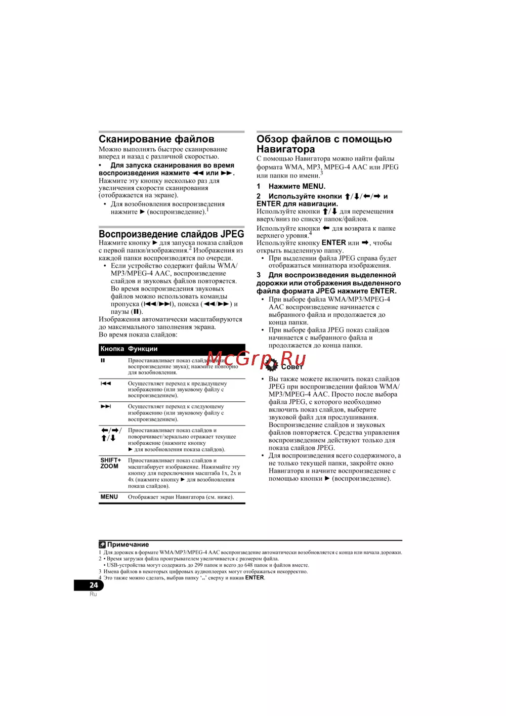 1 Для дорожек в формате WMA/MP3/MPEG-4 AAC воспроизведение автоматически возобновляется с конца или начала дорожки.