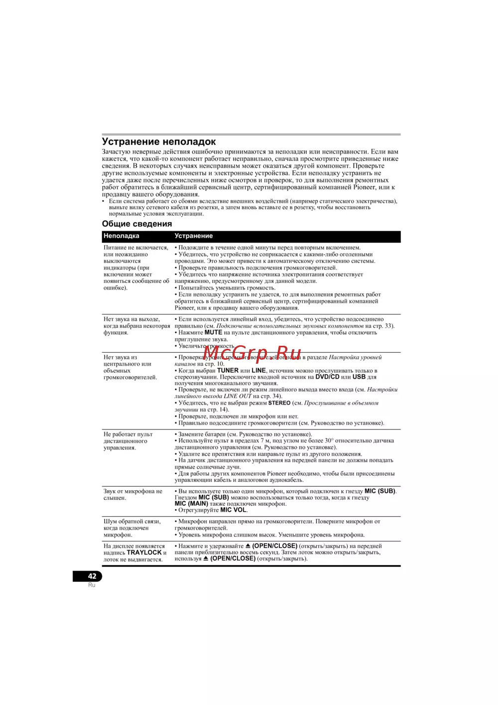 - Зачастую неверные действия ошибочно принимаются за неполадки или неисправности если вам кажется что какой то компонент работает неправильно сначала просмотрите приведенные ниже сведения в некоторых случаях неисправным может оказаться другой компонент проверьте другие используемые компоненты и электронные устройства если неполадку устранить не удается даже после перечисленных ниже осмотров и проверок то для выполнения ремонтных работ обратитесь в ближайший сервисный центр сертифицированный компанией pioneer или к продавцу вашего оборудования p.42