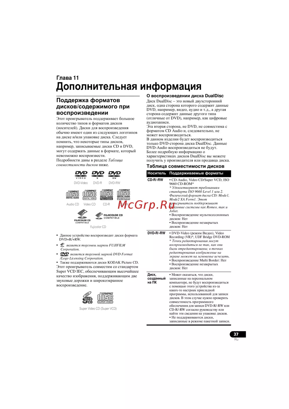 - Поддержка форматов дисков содержимого при воспроизведении p.37