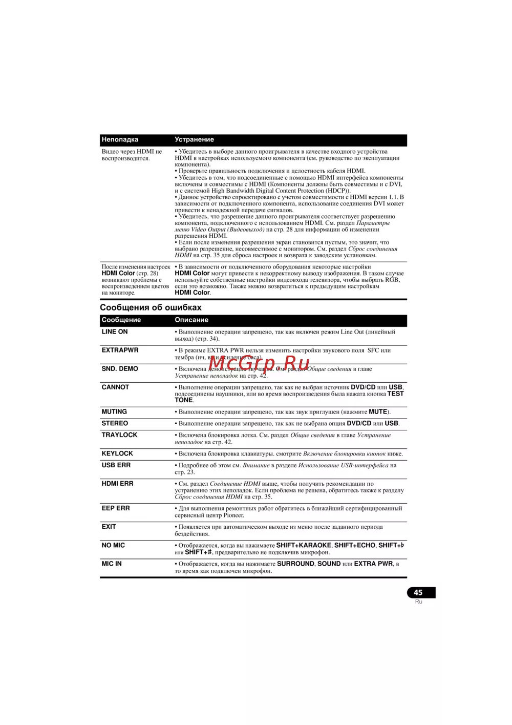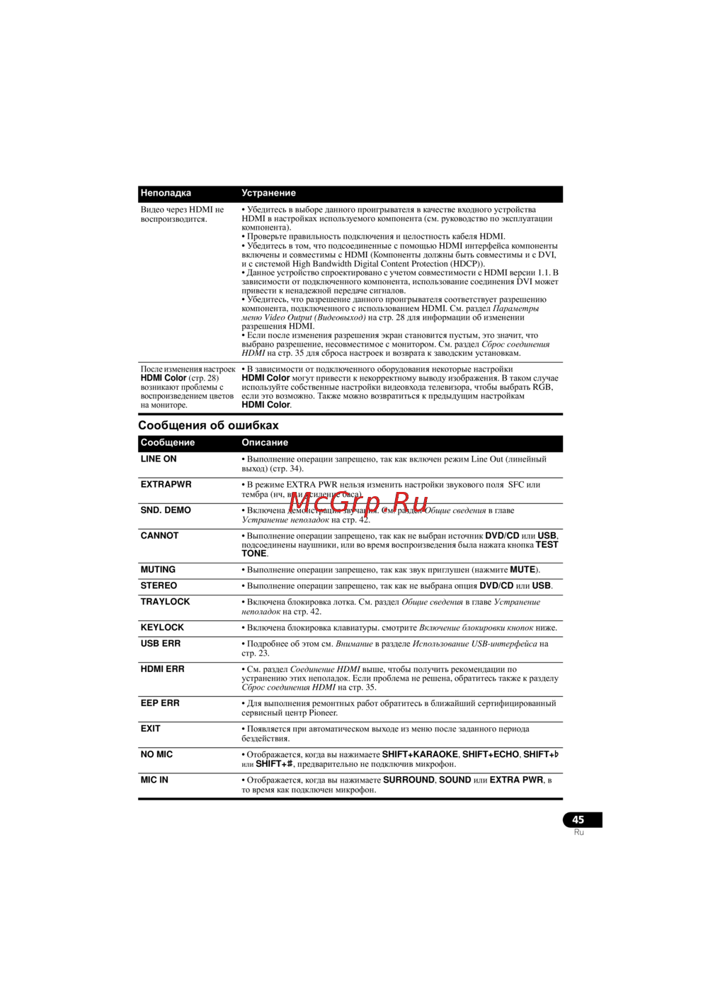 - Зачастую неверные действия ошибочно принимаются за неполадки или неисправности если вам кажется что какой то компонент работает неправильно сначала просмотрите приведенные ниже сведения в некоторых случаях неисправным может оказаться другой компонент проверьте другие используемые компоненты и электронные устройства если неполадку устранить не удается даже после перечисленных ниже осмотров и проверок то для выполнения ремонтных работ обратитесь в ближайший сервисный центр сертифицированный компанией pioneer или к продавцу вашего оборудования p.42