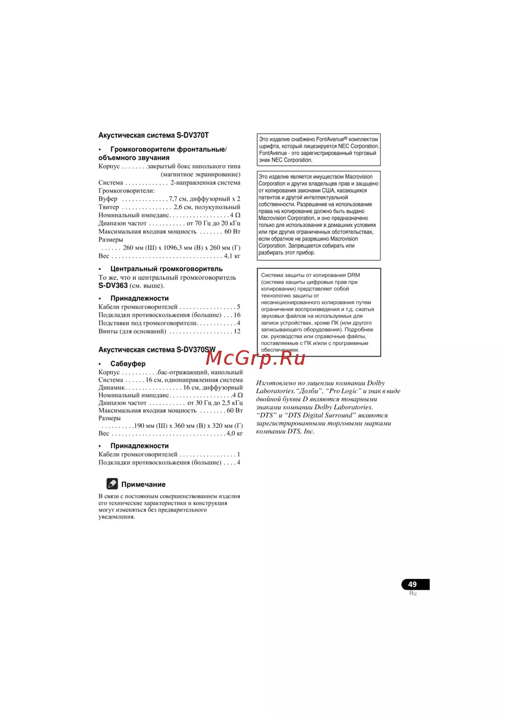 - Изготовлено по лицензии компании dolby laboratories долби pro logic и знак в виде двойной буквы d являются товарными знаками компании dolby laboratories dts и dts digital surround являются зарегистрированными торговыми марками компании dts inc p.49
