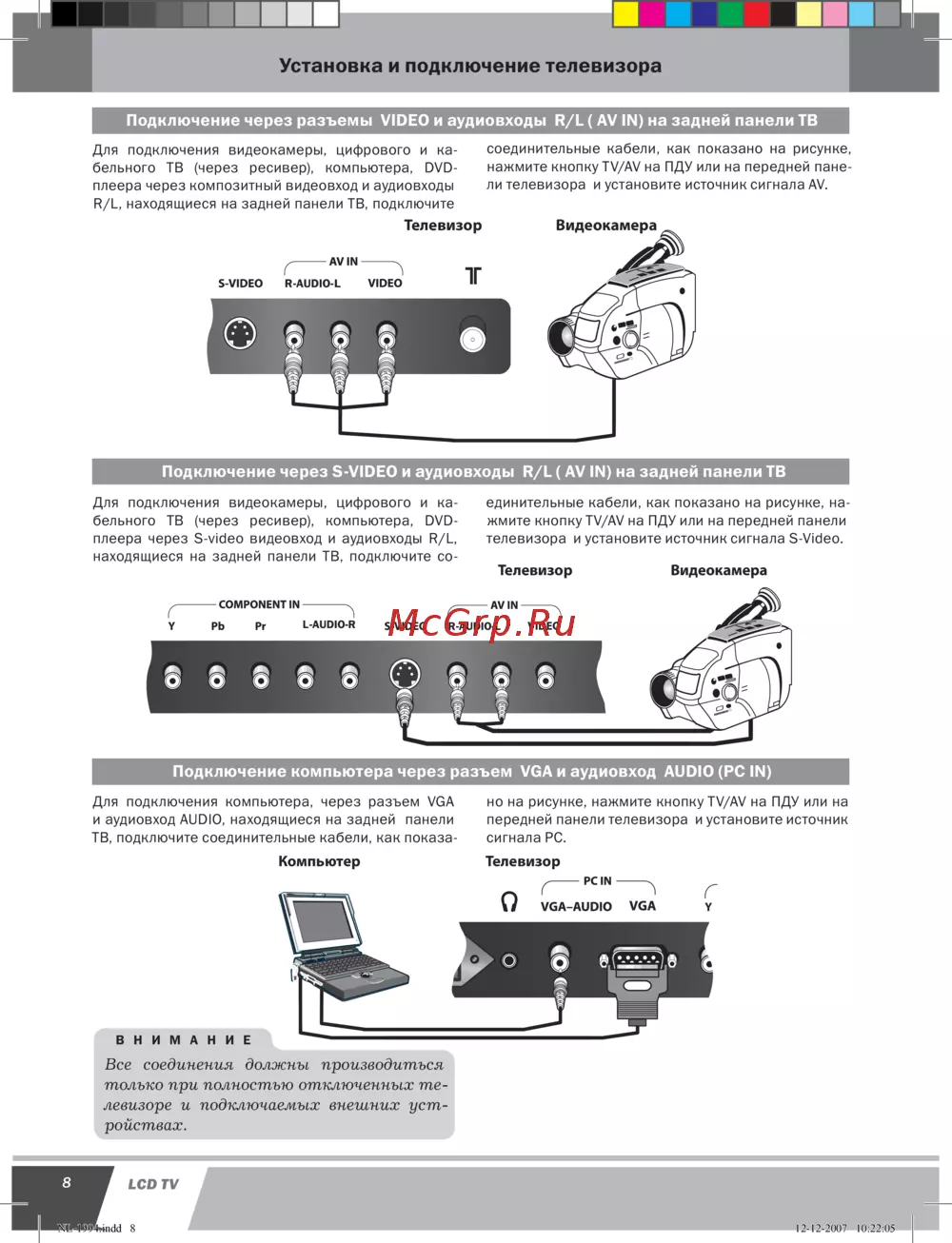 - Подключение через компонентный видеовход и аудиовходы r l component in p.8