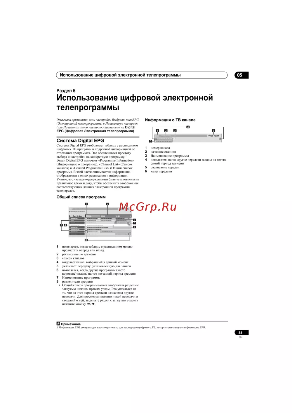 1 Информация EPG доступна для просмотра только для тех передач цифрового ТВ, которые транслируют информацию EPG.