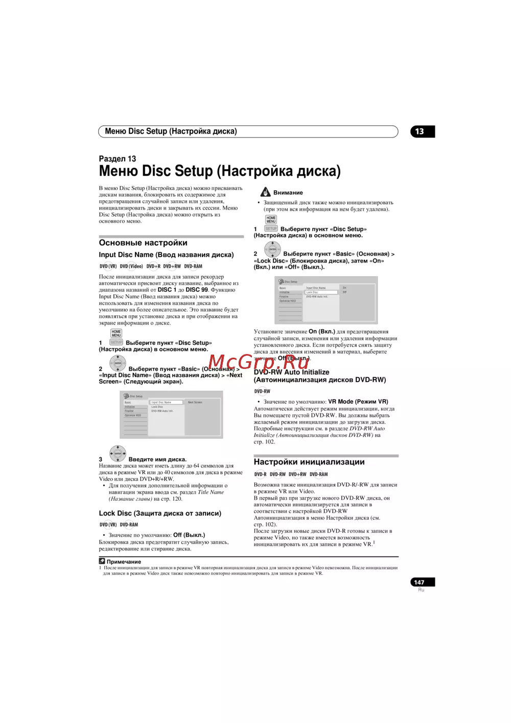 1 После инициализации для записи в режиме VR повторная инициализация диска для записи в режиме Video невозможна. После инициализации