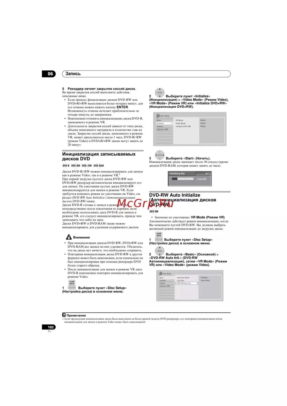 «VR Mode» (Режим VR) или «Initialize DVD+RW»