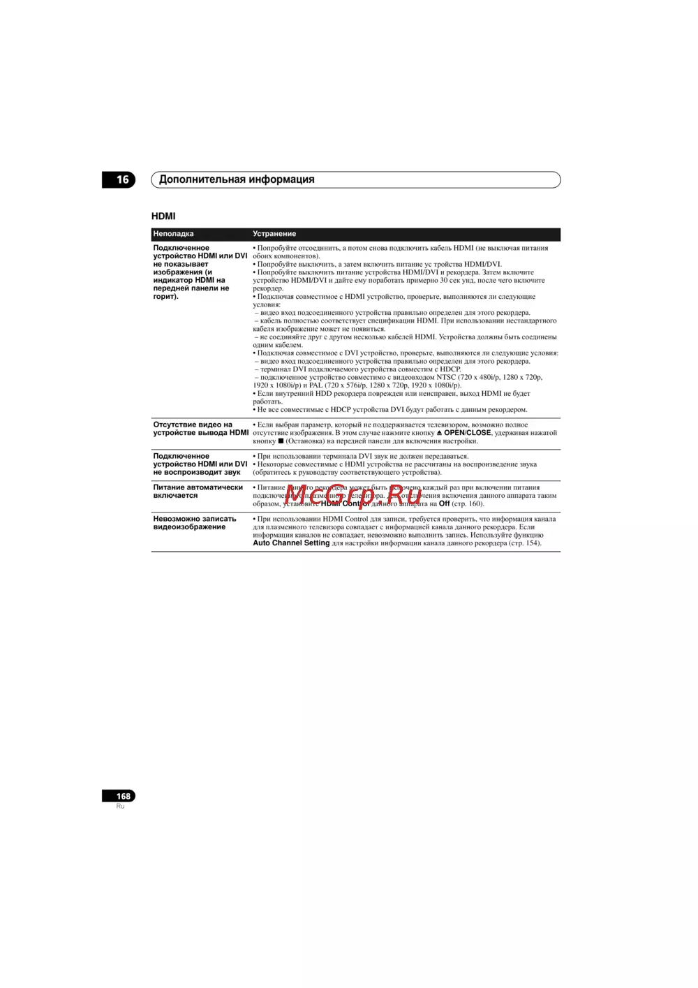 • Если внутренний HDD рекордера поврежден или неисправен, выход HDMI не будет