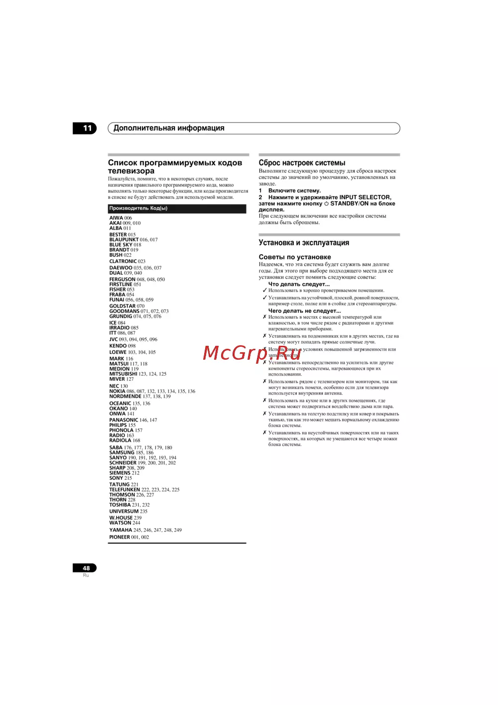 Pioneer AS-LX70 [48/179] Список программируемых кодов телевизора