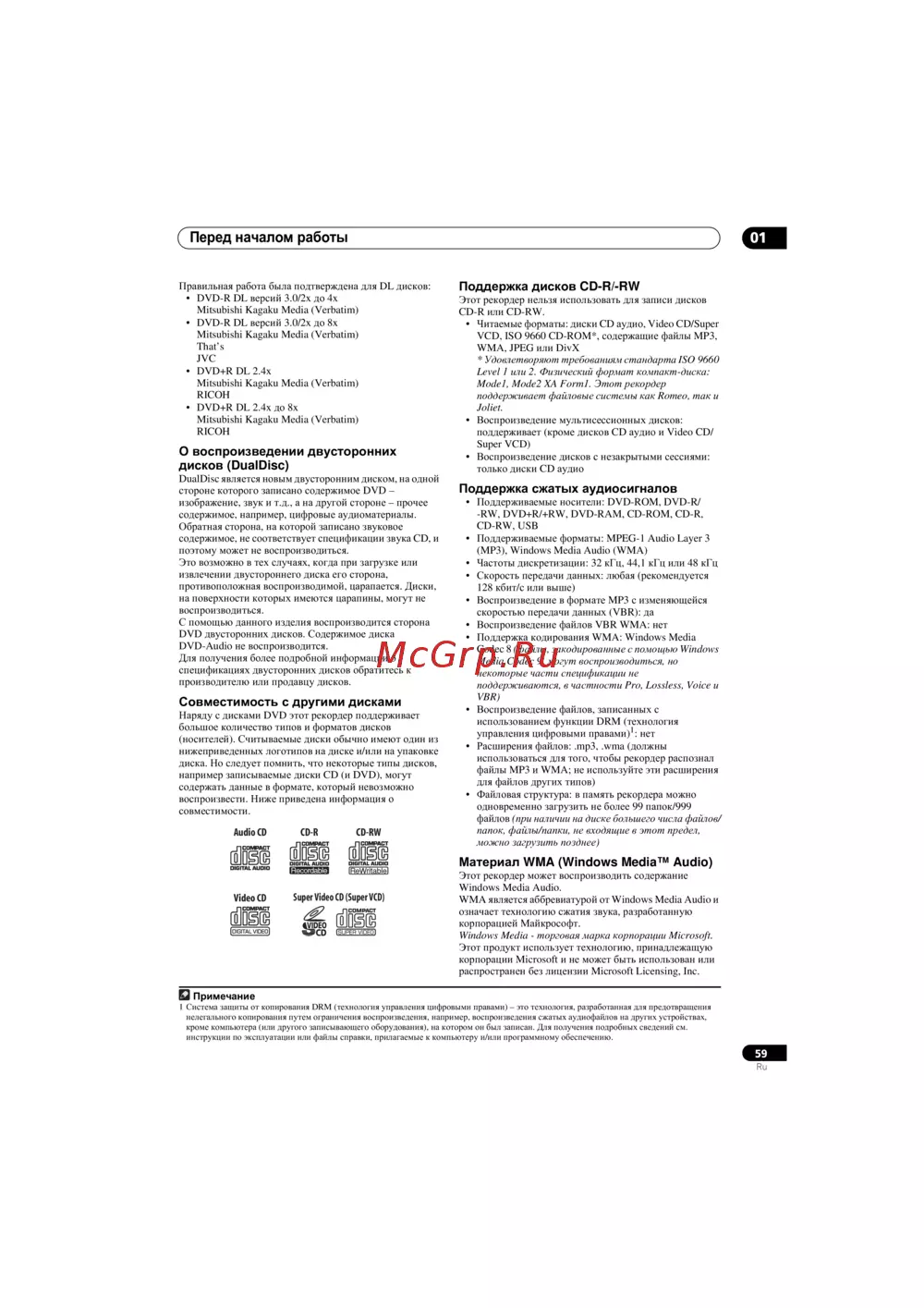 Узнайте о совместимости рекордера с DVD, CD и другими форматами. Подробности о воспроизведении двусторонних дисков и поддерживаемых аудиоформатах.