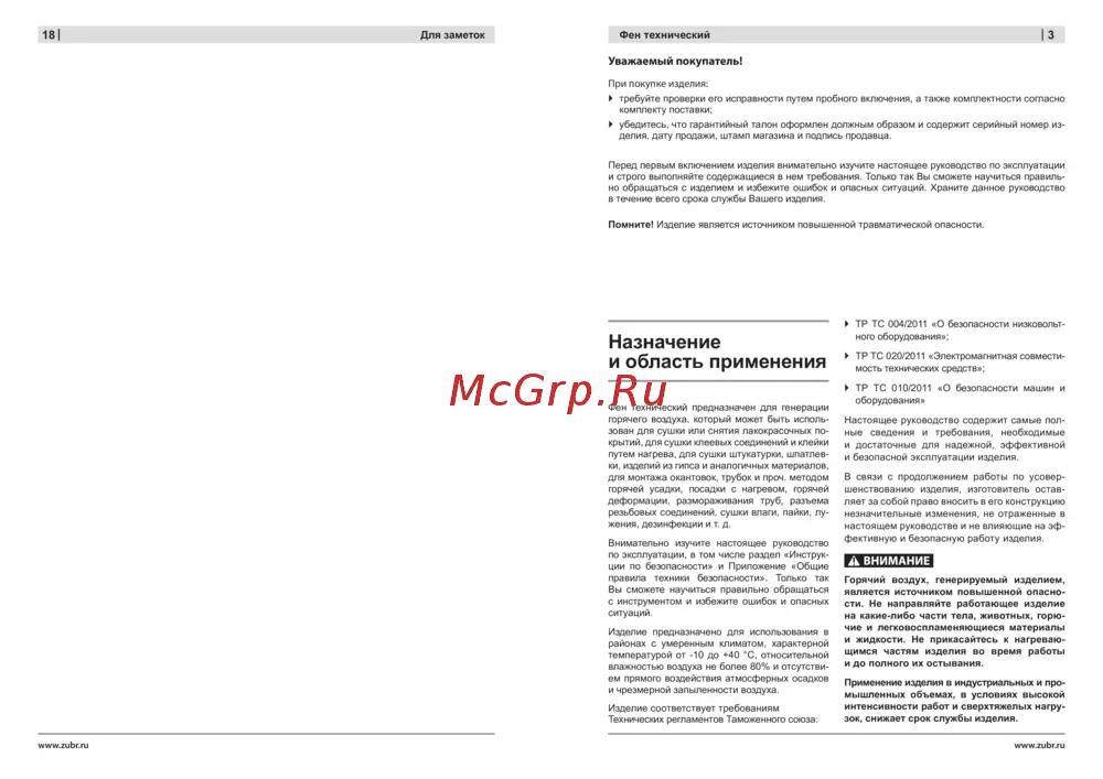 18 Для заметок 3 Фен технический Уважаемый покупатель При покупке изделия требуйте проверки его исправности путем пробного включения а также комплектности согласно комплекту поставки убедитесь что гарантийный талон оформлен должным образом и содержит серийный номер из делия дату продажи штамп магазина и подпись продавца Перед первым включением изделия внимательно изучите настоящее руководство по эксплуатации и строго выполняйте содержащиеся в нем требования Только так Вы сможете научиться правиль но обращаться с изделием и избежите ошибок и опасных ситуаций Храните данное руководство в течение всего срока службы Вашего изделия Помните Изделие является источником повышенной травматической опасности Назначение и область применения Фен технический предназначен для генерации горячего воздуха который может быть исполь зован для сушки или снятия лакокрасочных по крытий для сушки клеевых соединений и клейки путем нагрева для сушки штукатурки шпатлев ки изделий из гипса и аналогичных материалов для монтажа окантовок трубок и проч методом горячей усадки посадки с нагревом горячей деформации размораживания труб разъема резьбовых соединений сушки влаги пайки лу жения дезинфекции и т д Внимательно изучите настоящее руководство по эксплуатации в том числе раздел Инструк ции по безопасности и Приложение Общие правила техники безопасности Только так Вы сможете научиться правильно обращаться с инструментом и избежите ошибок и опасных ситуаций Изделие предназначено для использования в районах с умеренным климатом характерной температурой от 10 до 40 С относительной влажностью воздуха не более 80 и отсутстви ем прямого воздействия атмосферных осадков и чрезмерной запыленности воздуха Изделие соответствует требованиям Технических регламентов Таможенного союза www zubr ru ТР ТС 004 2011 О безопасности низковольт ного оборудования ТР ТС 020 2011 Электромагнитная совмести мость технических средств ТР ТС 010 2011 О безопасности машин и оборудования Настоящее руководство содержит самые пол ные сведения и требования необходимые и достаточные для надежной эффективной и безопасной эксплуатации изделия В связи с продолжением работы по усовер шенствованию изделия изготовитель остав ляет за собой право вносить в его конструкцию незначительные изменения не отраженные в настоящем руководстве и не влияющие на эф фективную и безопасную работу изделия А ВНИМАНИЕ Горячий воздух генерируемый изделием является источником повышенной опасно сти Не направляйте работающее изделие на какие либо части тела животных горю чие и легковоспламеняющиеся материалы и жидкости Не прикасайтесь к нагреваю щимся частям изделия во время работы и до полного их остывания Применение изделия в индустриальных и про мышленных объемах в условиях высокой интенсивности работ и сверхтяжелых нагру зок снижает срок службы изделия www zubr ru