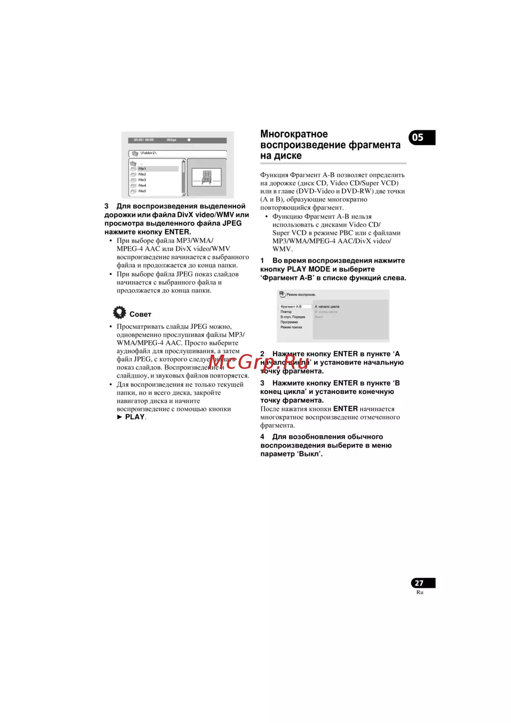 ![Pioneer DV-410 V K [27/52] Многократное воспроизведение фрагмента на диске](/views2/1089487/page27/bg1b.png)