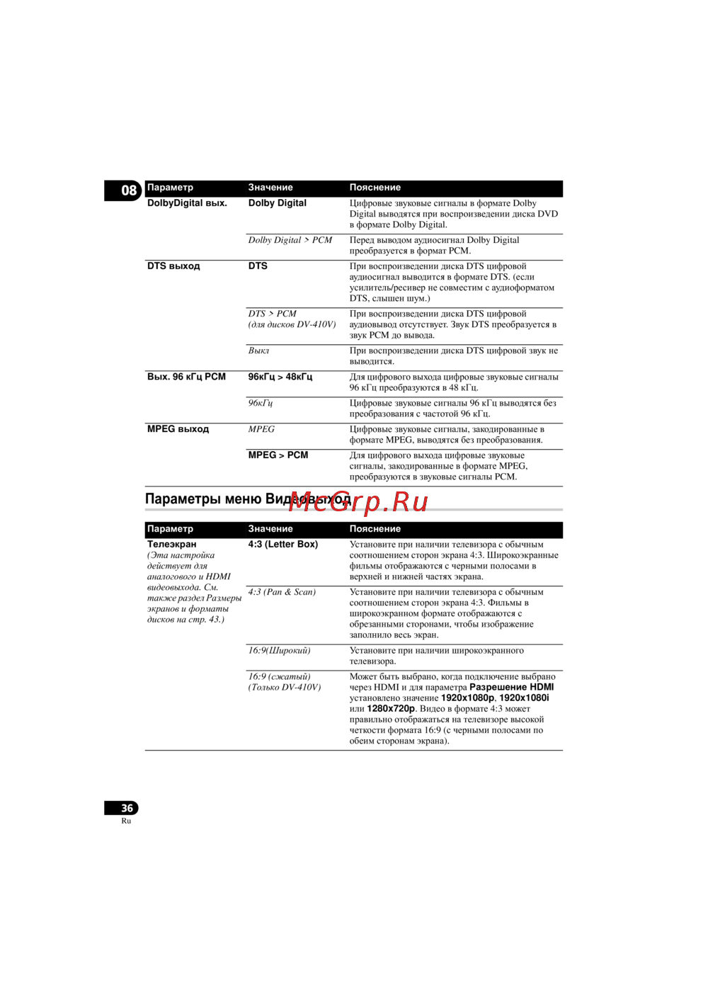- Параметры меню аудиовыход p.35
